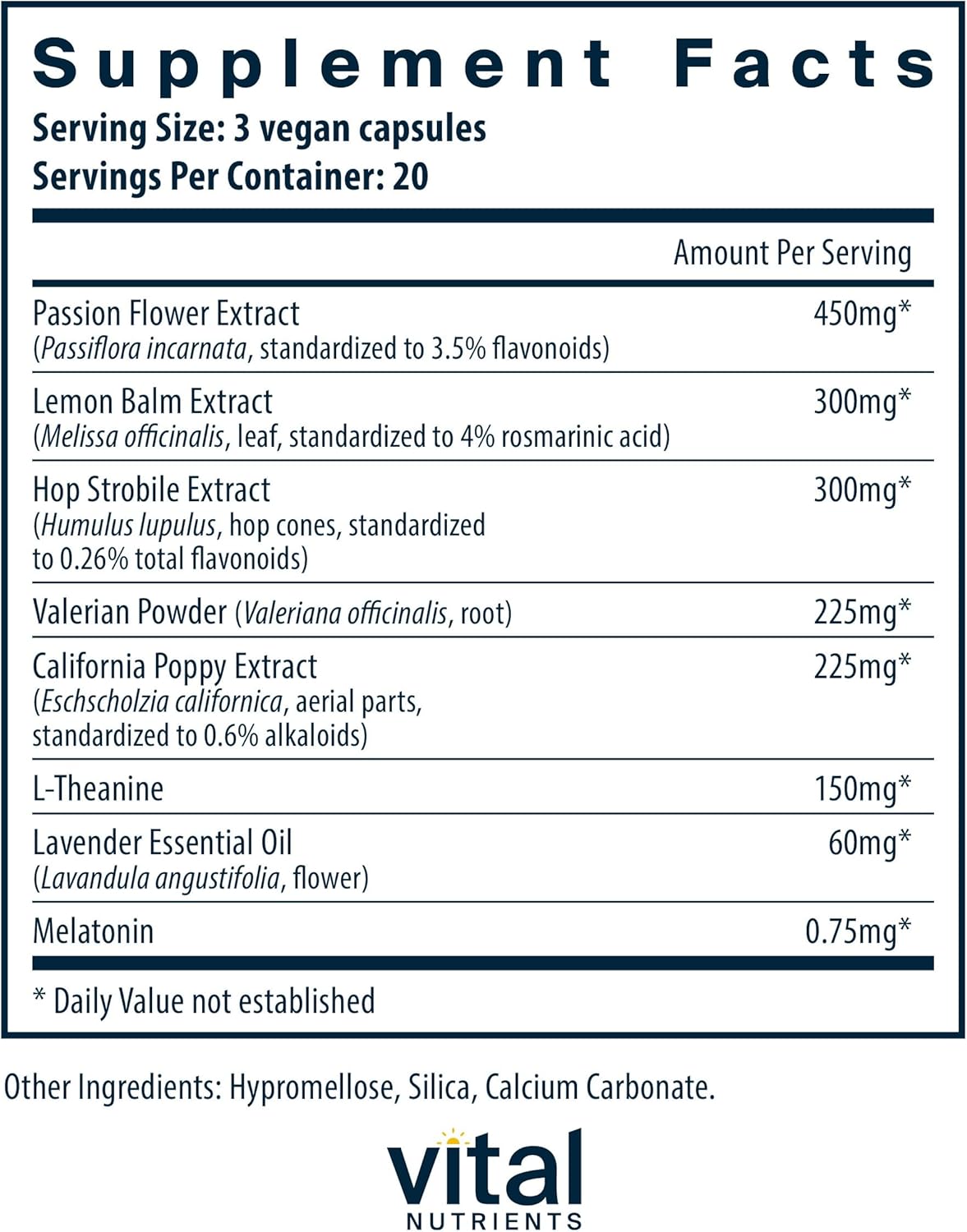 - Synergistic Botanical Blend Helps Calm the Central Nervous System: This unique sleep aid supplement provides ingredients including passionflower, lemon balm, hops, valerian root, L-theanine, and California poppy, with a natural, soothing lavender scent to ease nervous tension and support healthy relaxation, sleep onset, and muscular comfort.