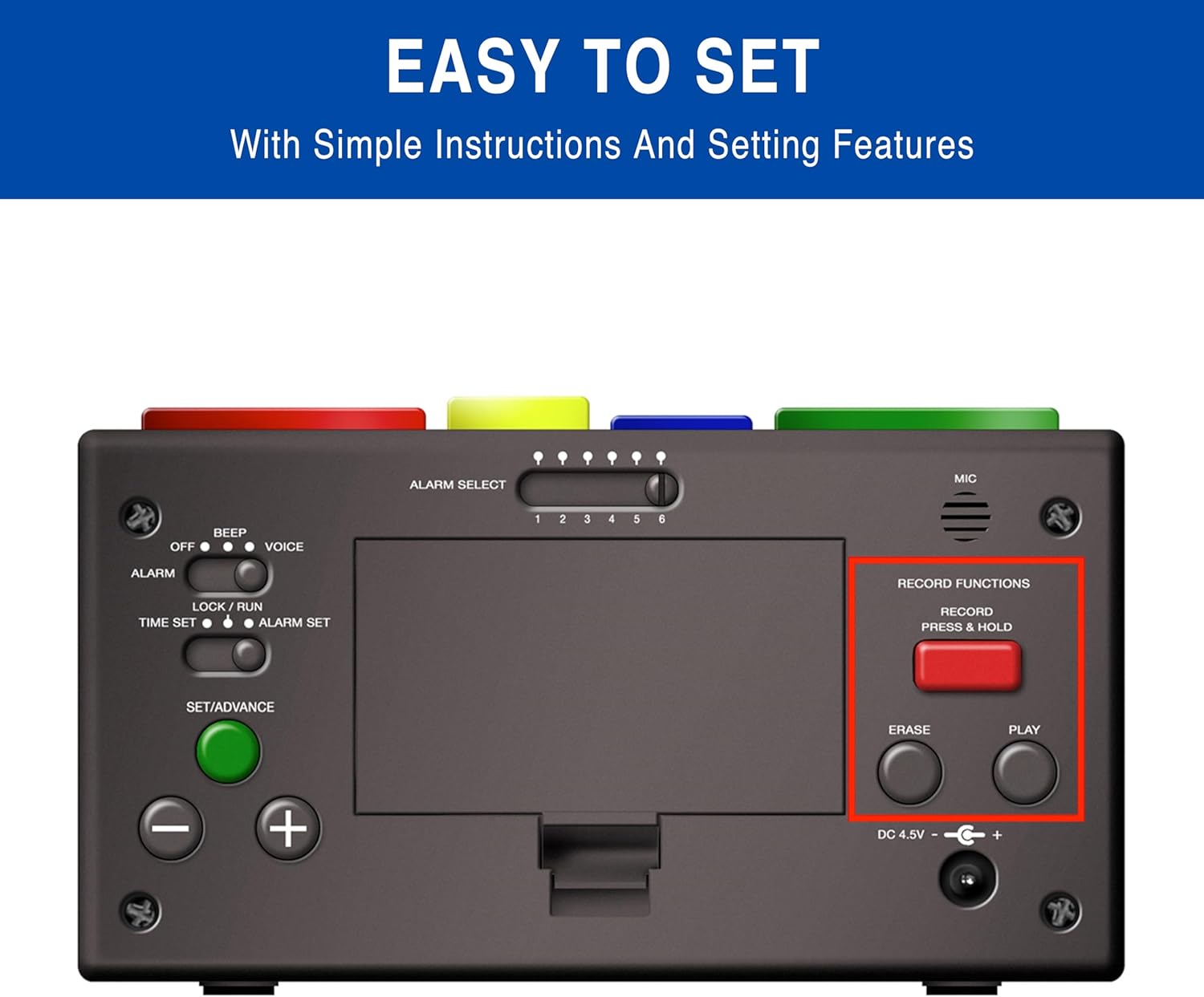 - TALKING ALARM CLOCK: Pre-record and playback up to 6 custom reminders throughout the day. Useful aid in remembering daily tasks like taking medications, that it's lunchtime or that a program you enjoy is ready to start. The custom recorded message allows for a familiar voice to alert the user of any task.