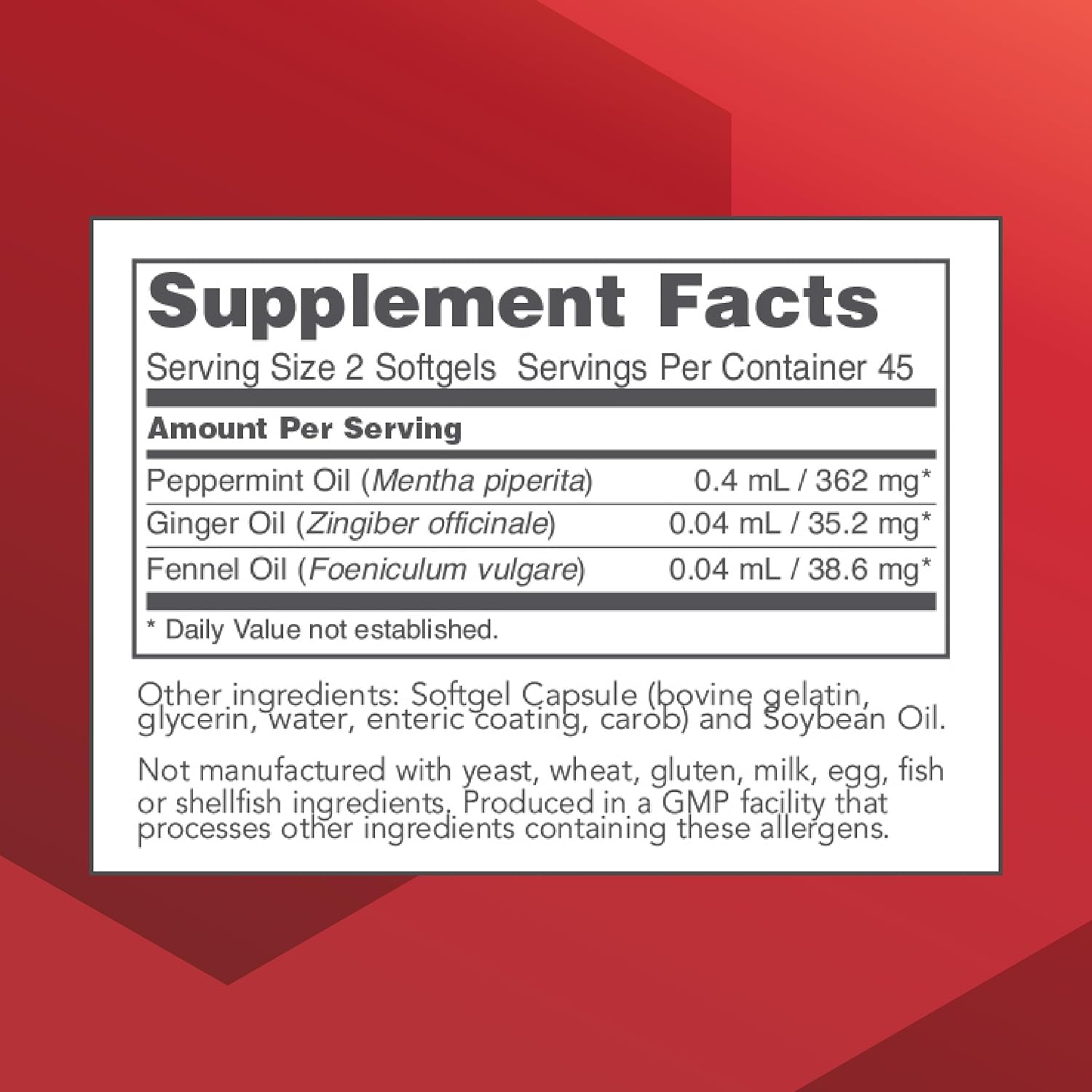 - Enteric-Coated: Specially formulated to release peppermint oil directly in the intestinal tract, combined with ginger oil and fennel oil for digestive support*
