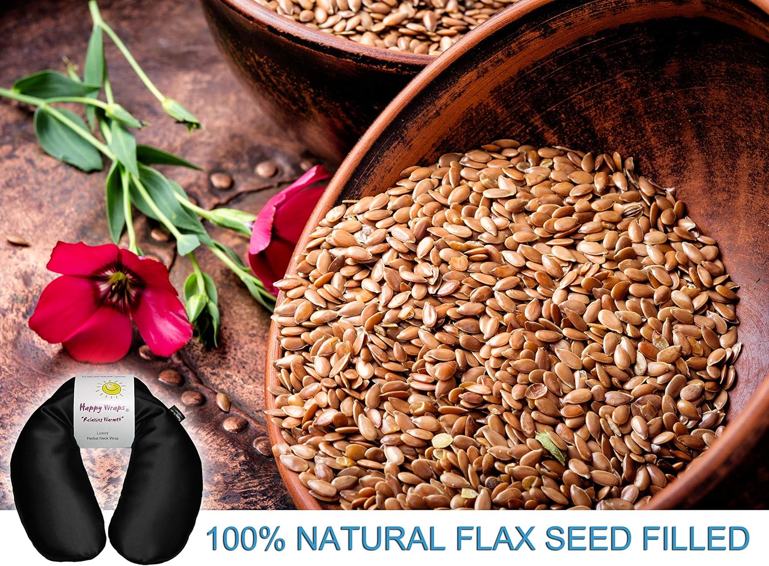 Microwavable Herbal Neck Wrap - Hot Cold Aromatherapy Neck Warming Pillow - Heating Pad for Migraines, Stress, Gifts for Women, Birthdays, Christmas and Free Sleep Mask - Onyx Satin