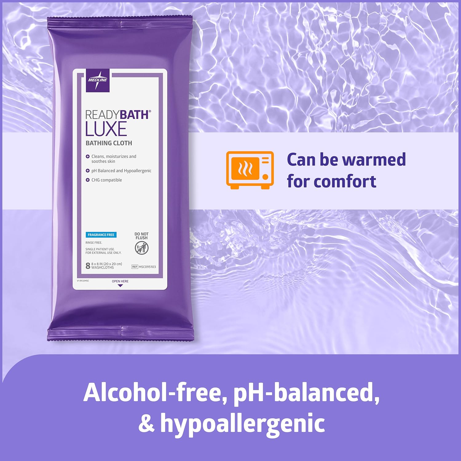 - Stay comfortable while cleansing - ReadyBath LUXE bathing wipes are formulated to soothe skin and also eliminate odors and kill germs, and can be warmed to comfort sensitive skin