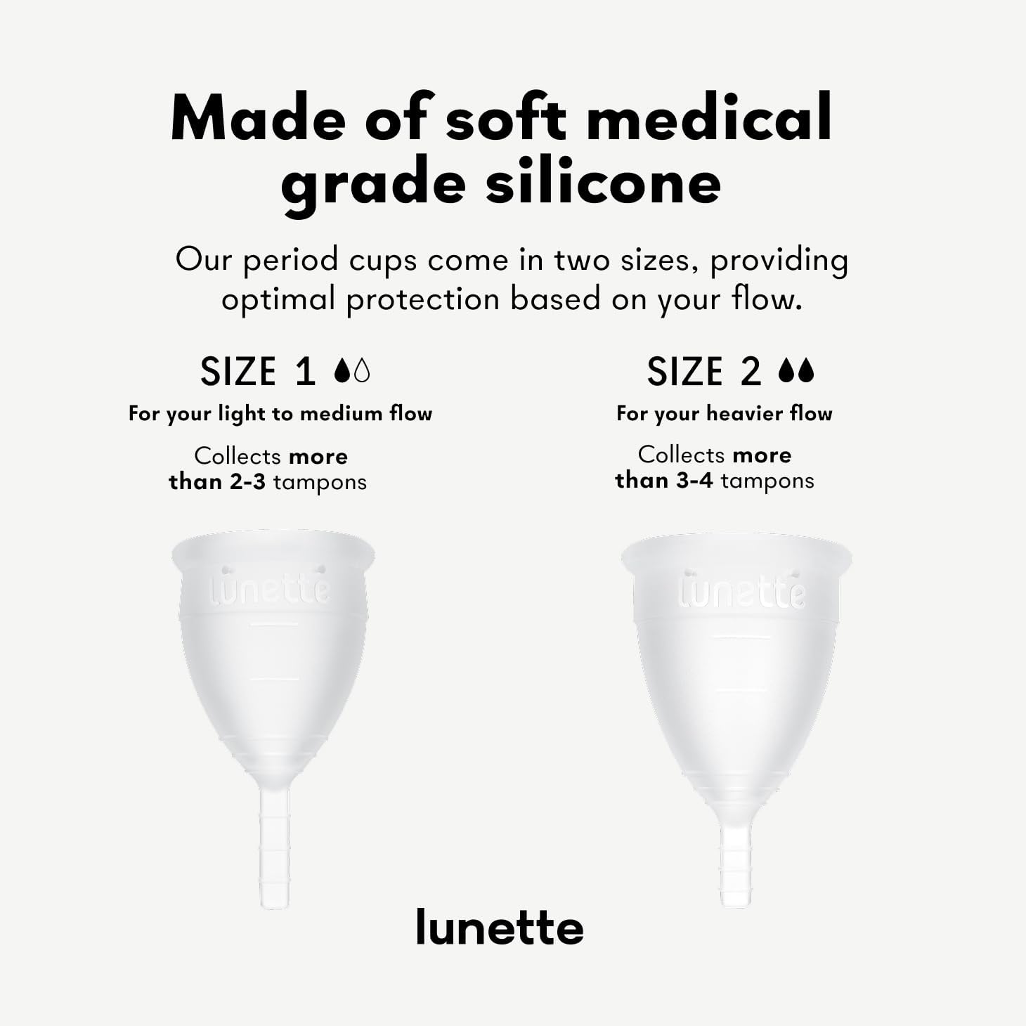 - Lunette Period Cup comes in 6 colors in 2 sizes. Comfortable fit with a freedom to change less often as it can be worn for up to 12 hrs. Lunette Period Cup Size 1 is perfect for a light to medium flow