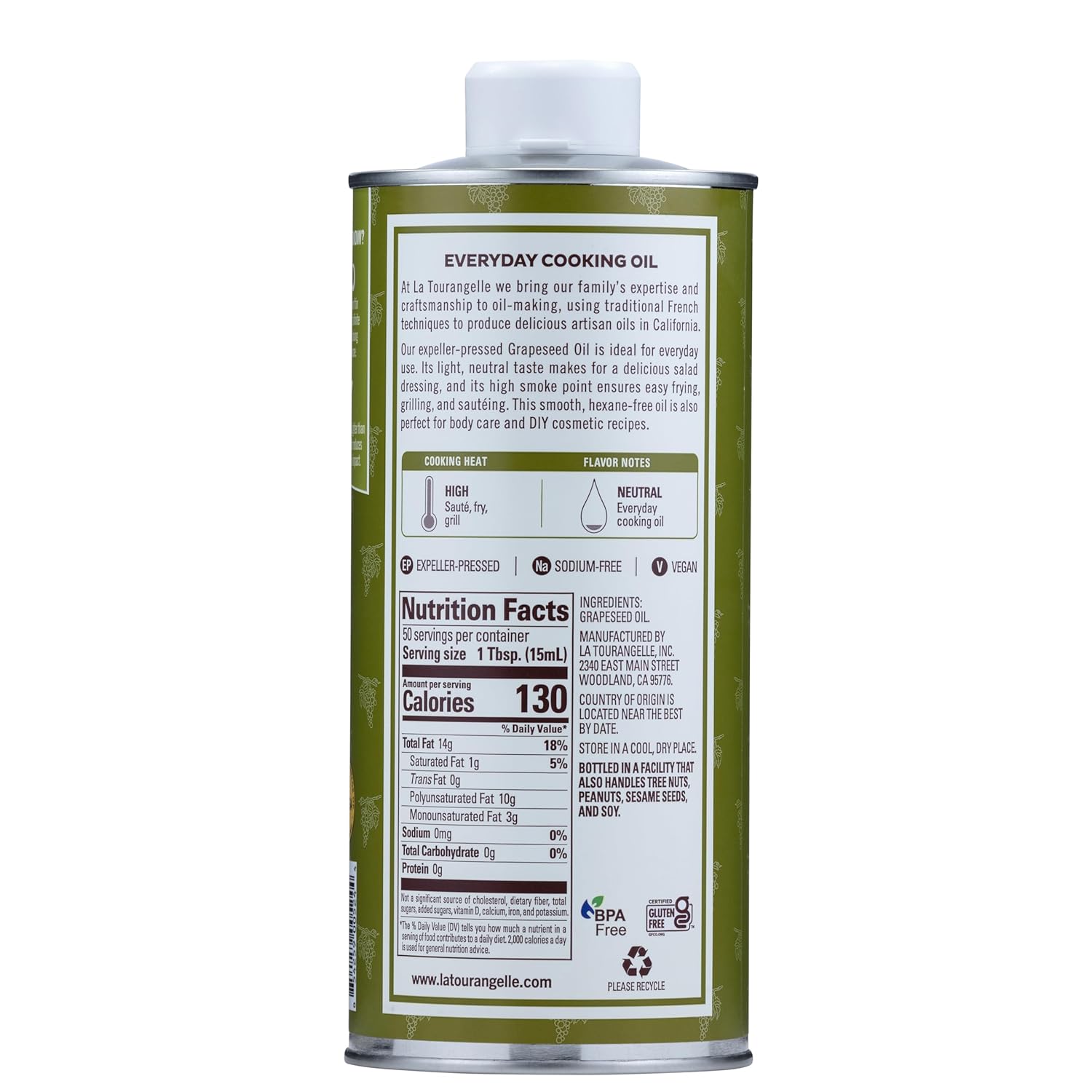 La Tourangelle, Expeller-Pressed Grapeseed Oil, High Heat Neutral Cooking Oil, Cast Iron Seasoning, Also Great for Skin, Hair, and DIY Beauty Recipes, 25.4 fl oz