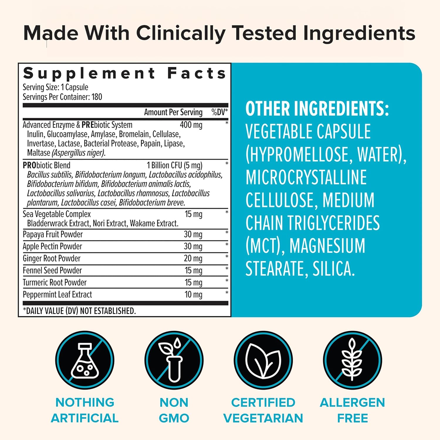 - Gas & Bloating Relief - Targeted enzymes work with beneficial microflora to ease uncomfortable bloating, reduce gas, and soothe digestive discomfort naturally