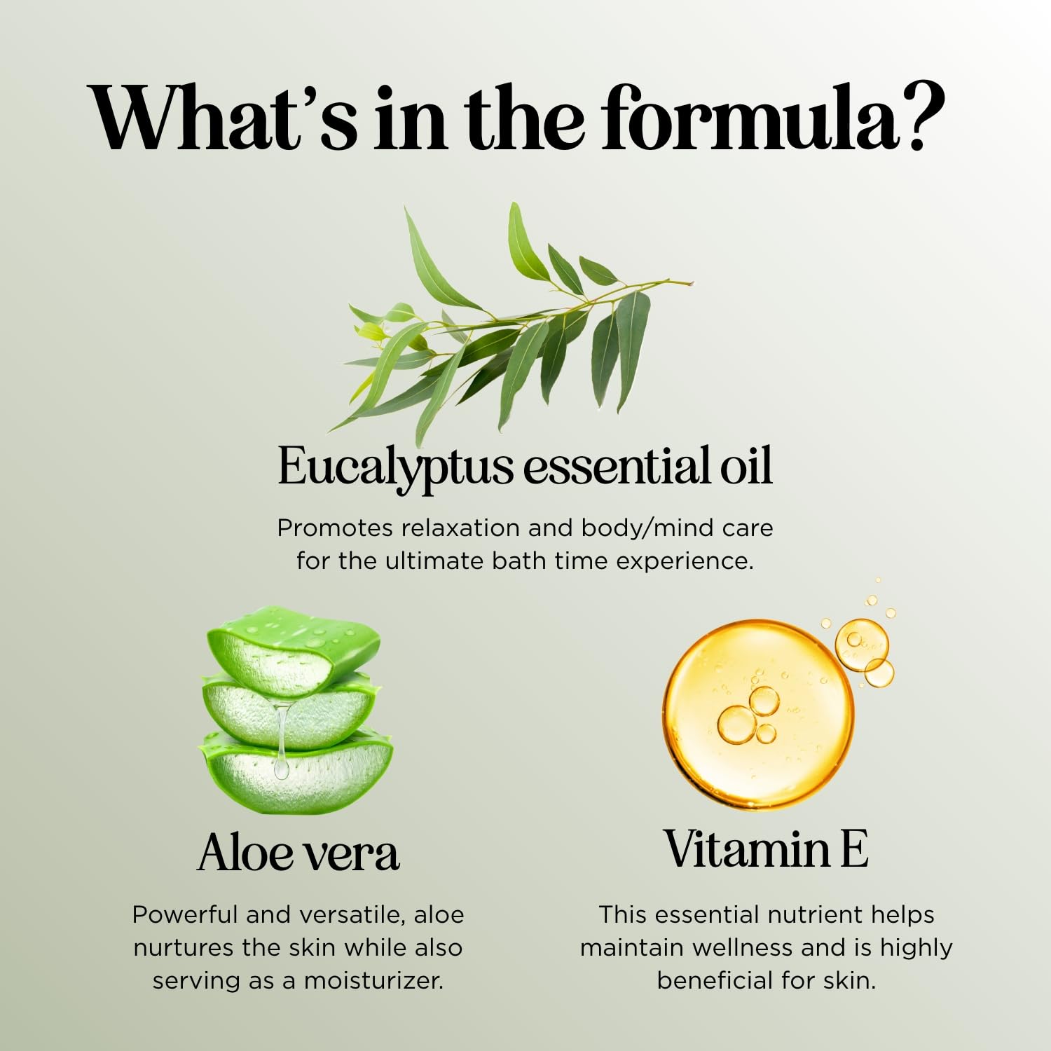 - Featuring Natural Oils - Our essential oil bubble bath formula made with chamomile aloe vera eucalyptus jojoba calendula and more transports both body and mind as you breathe in refreshing aromas