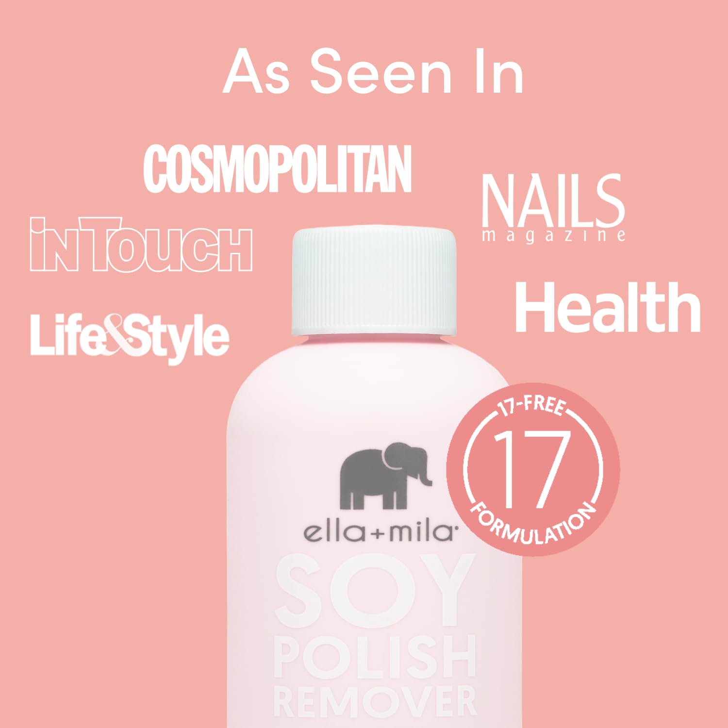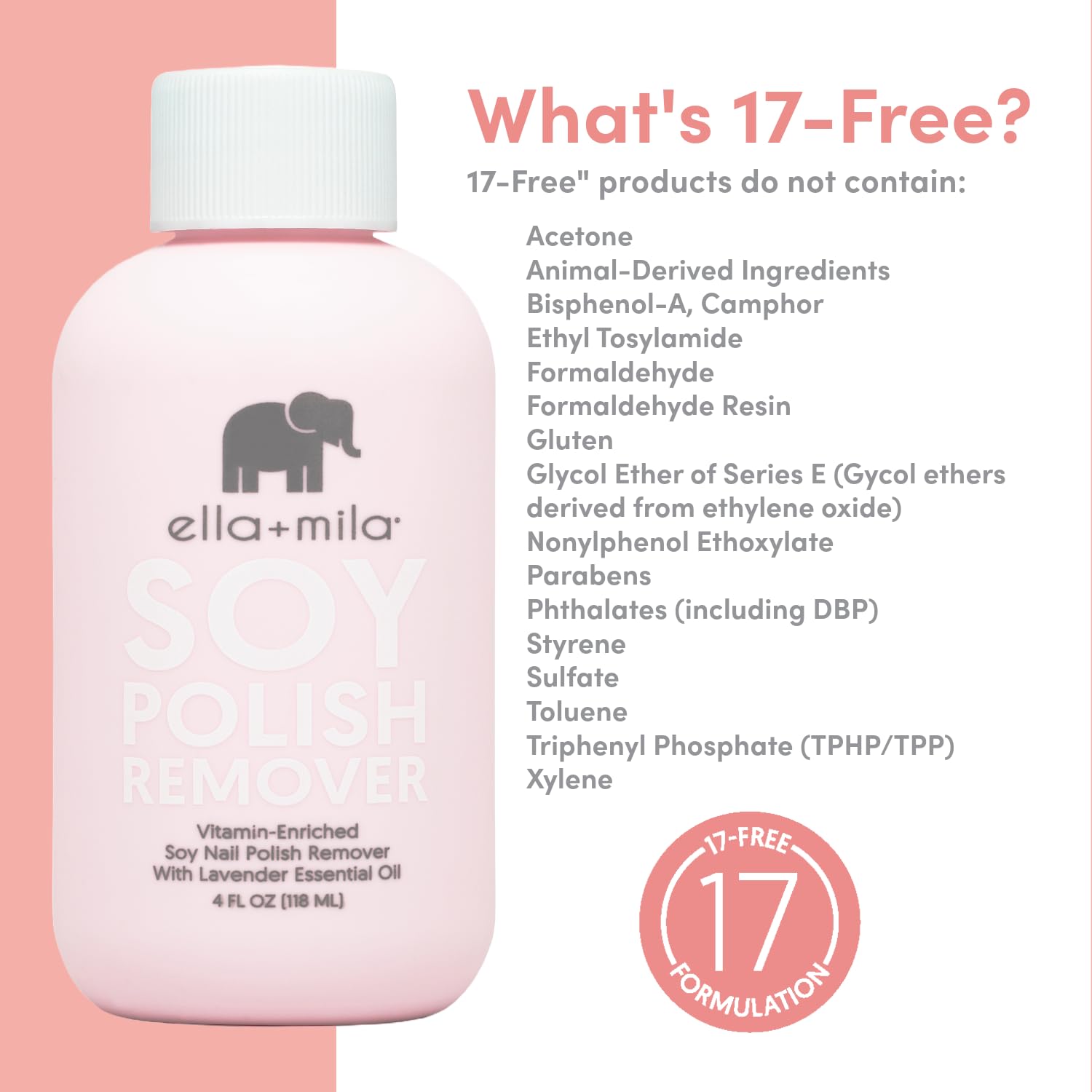 - Soy Nail Polish Remover by ella+mila: Non-toxic nail polish remover made without acetone & alcohol; Formulated to effectively remove natural nail polishes; Enriched with lavender essential oils & vitamins A, C & E to promote healthy & moisturized nails
