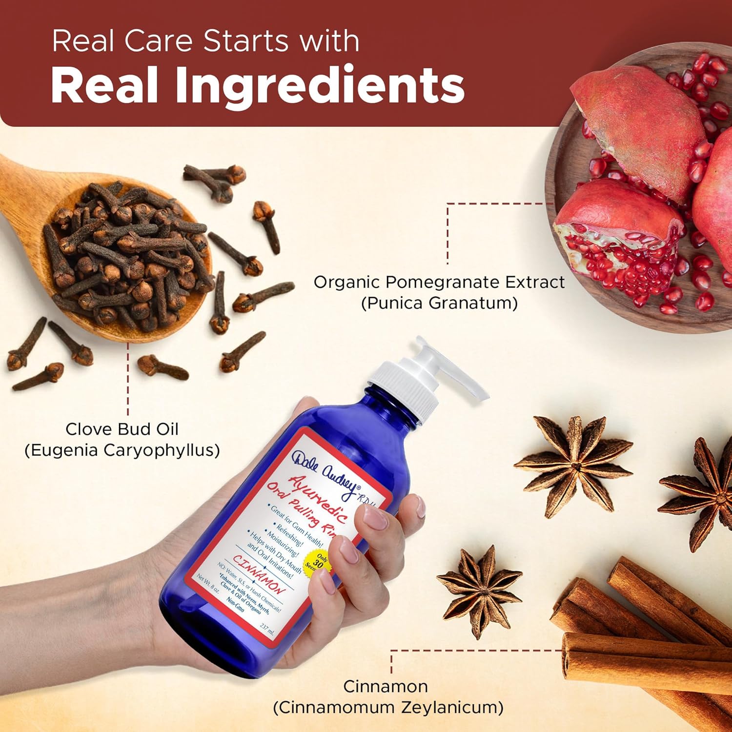 - AYURVEDIC SECRET TO ORAL HYGIENE: Dale Audrey R.D.H. Pulling oil for mouth gum health is a modernised version. This Oral Pulling Rinse is perfectly blended with the finest herbs and extracts that remove toxins from the body while not disturbing the delicate balance of oral flora found in your mouth Discover the secret of ancient Ayurveda oral care; oil pulling mouthwash which is over 5,000 years old.
