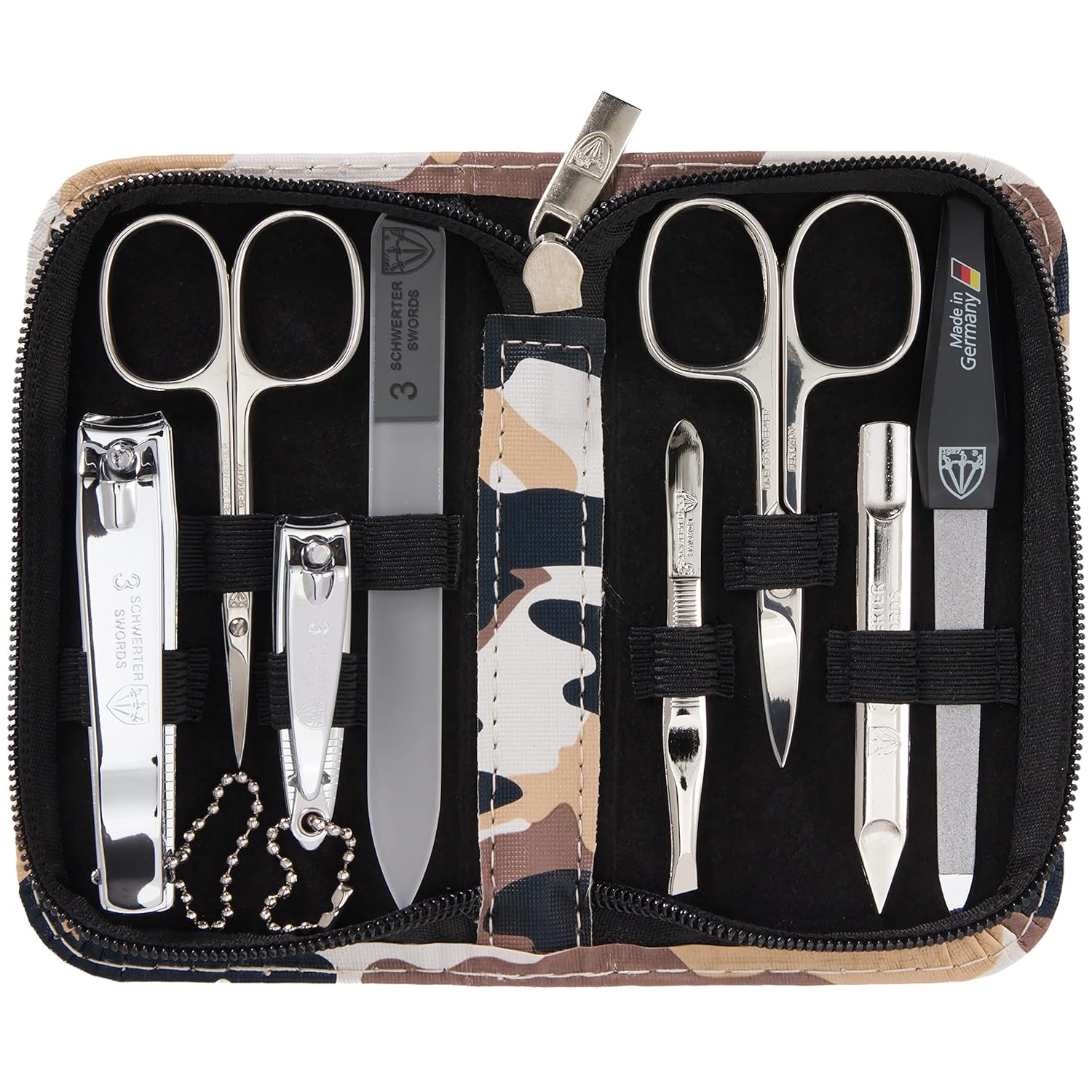 3 Swords Germany - brand quality 8 piece manicure pedicure grooming kit set synthetic leather case camouflage - Made in Germany