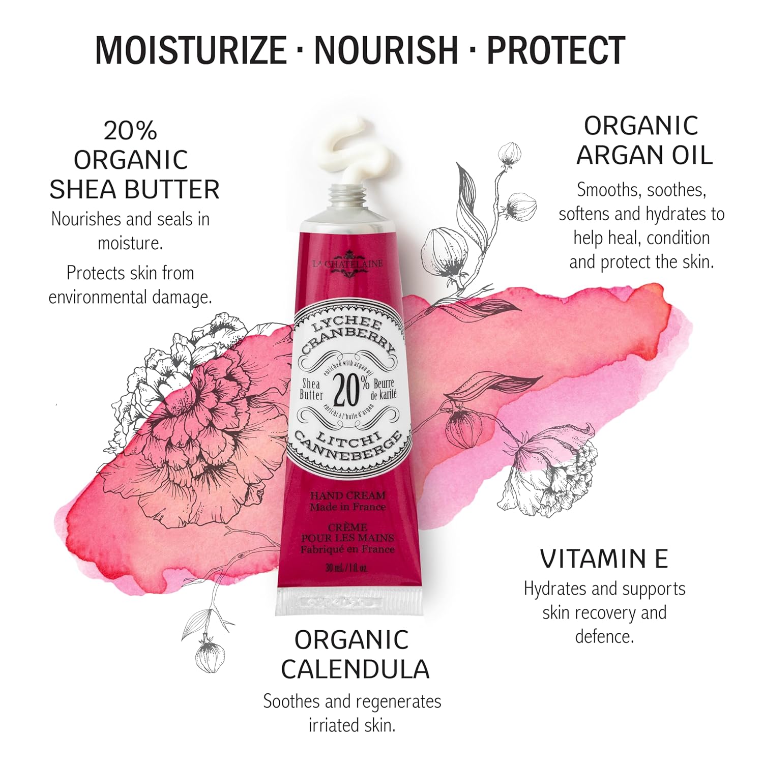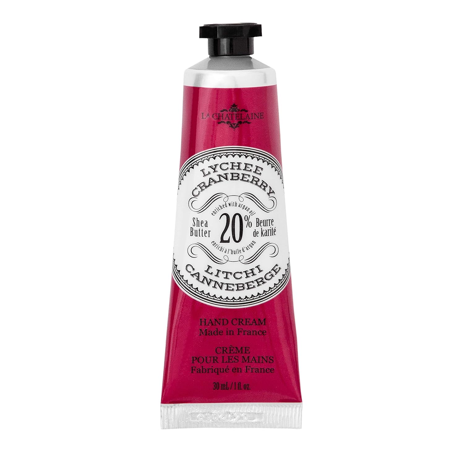 La Chatelaine 20% Shea Butter Hand Cream Travel Size, Organic Argan Oil, Moisturizing, Nourishing, Repairing, Extra-Rich Hand Lotion, Made in France, Paraben Free, 1 oz / 30ml (Lychee Cranberry)