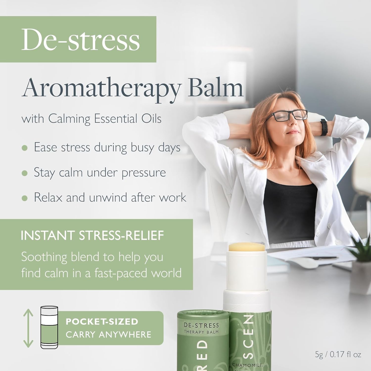 - Pocket-Sized Stress Reliever Balm – Scentered’s De-Stress balm blends stress relief essential oils to help ease stress and promote calm, perfect for winding down after a busy day. A calm carry essential and zen relief balm you’ll always want within reach. 5g / 0.17 oz.
