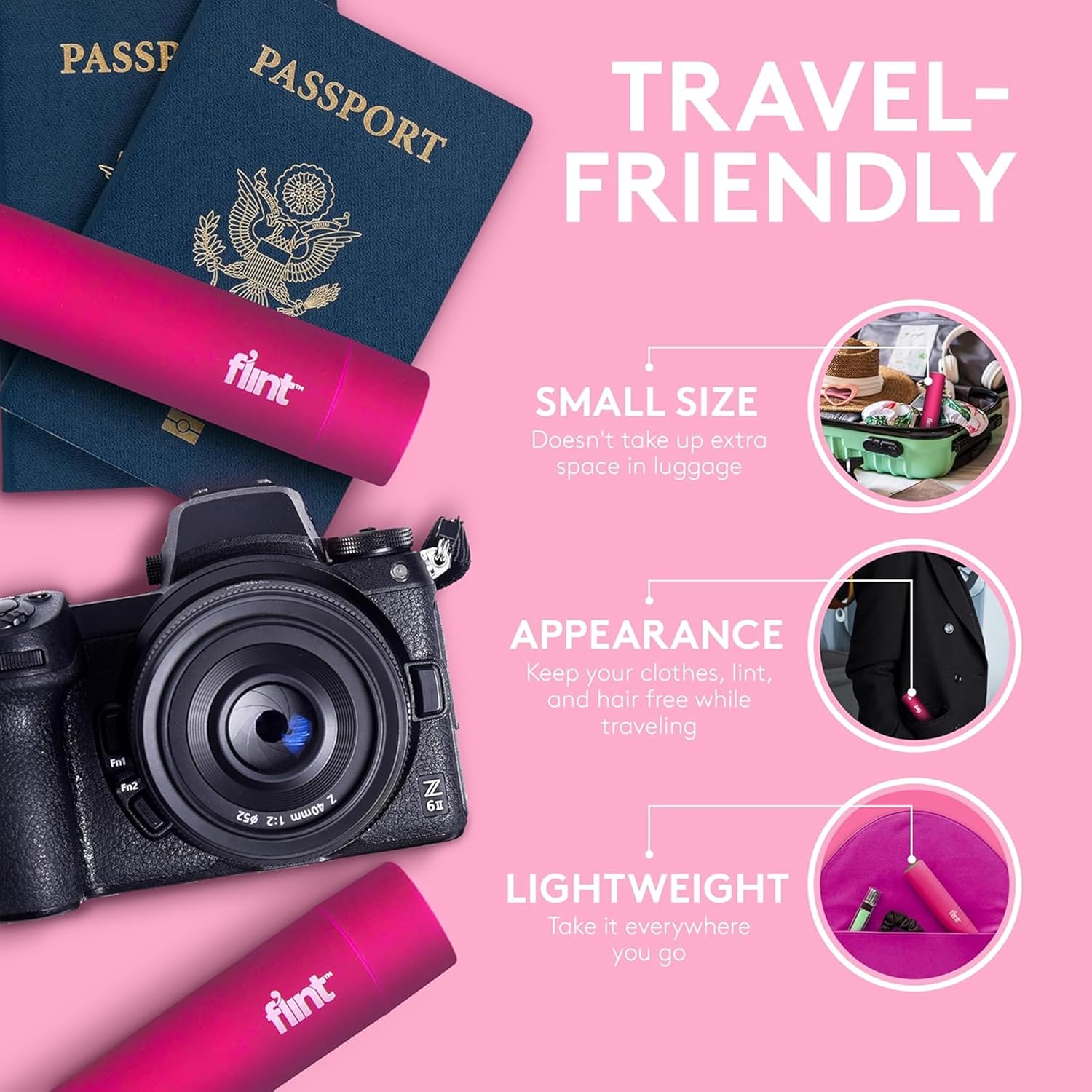 Flint Classic Pink Retractable Mini Lint Roller with 30 Extra Sticky Sheets, Small and Portable Lint Roller, Ideal Pet Hair Remover, Travel Lint Rollers for pet Hair Extra Sticky