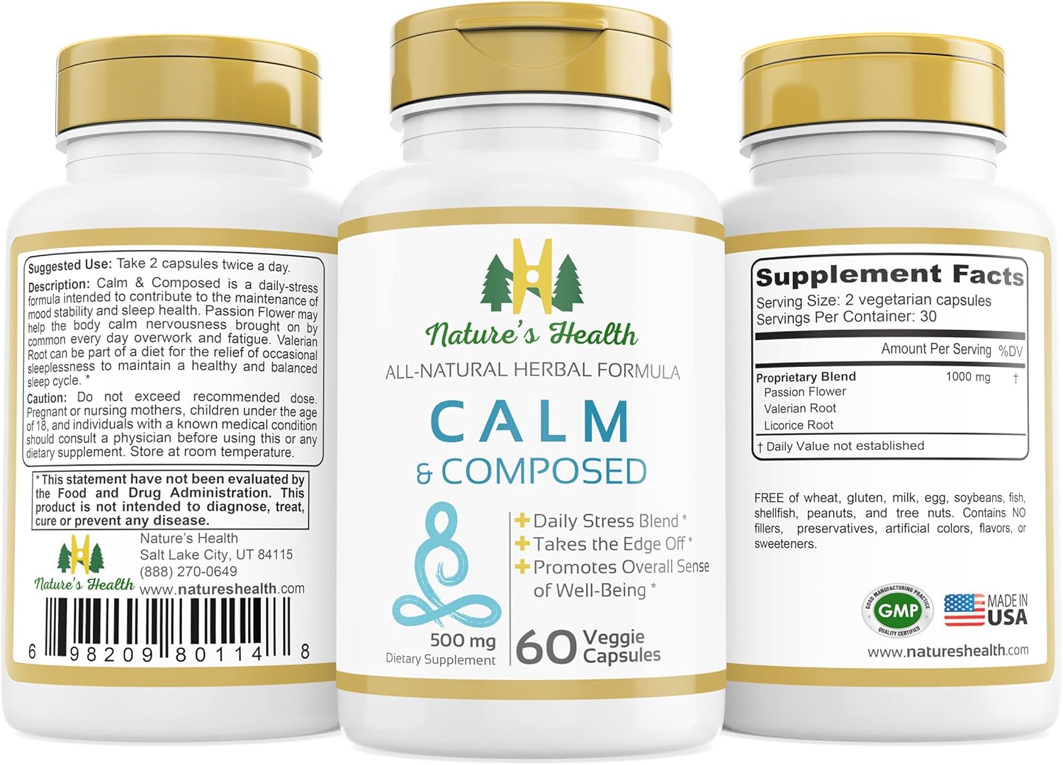 Nature's Health Calm and Composed – Valerian Root and Passion Flower Formula – Daily Stress Relief – Relaxation Supplement – 1000 mg per Serving – 60 Vegetarian Capsules