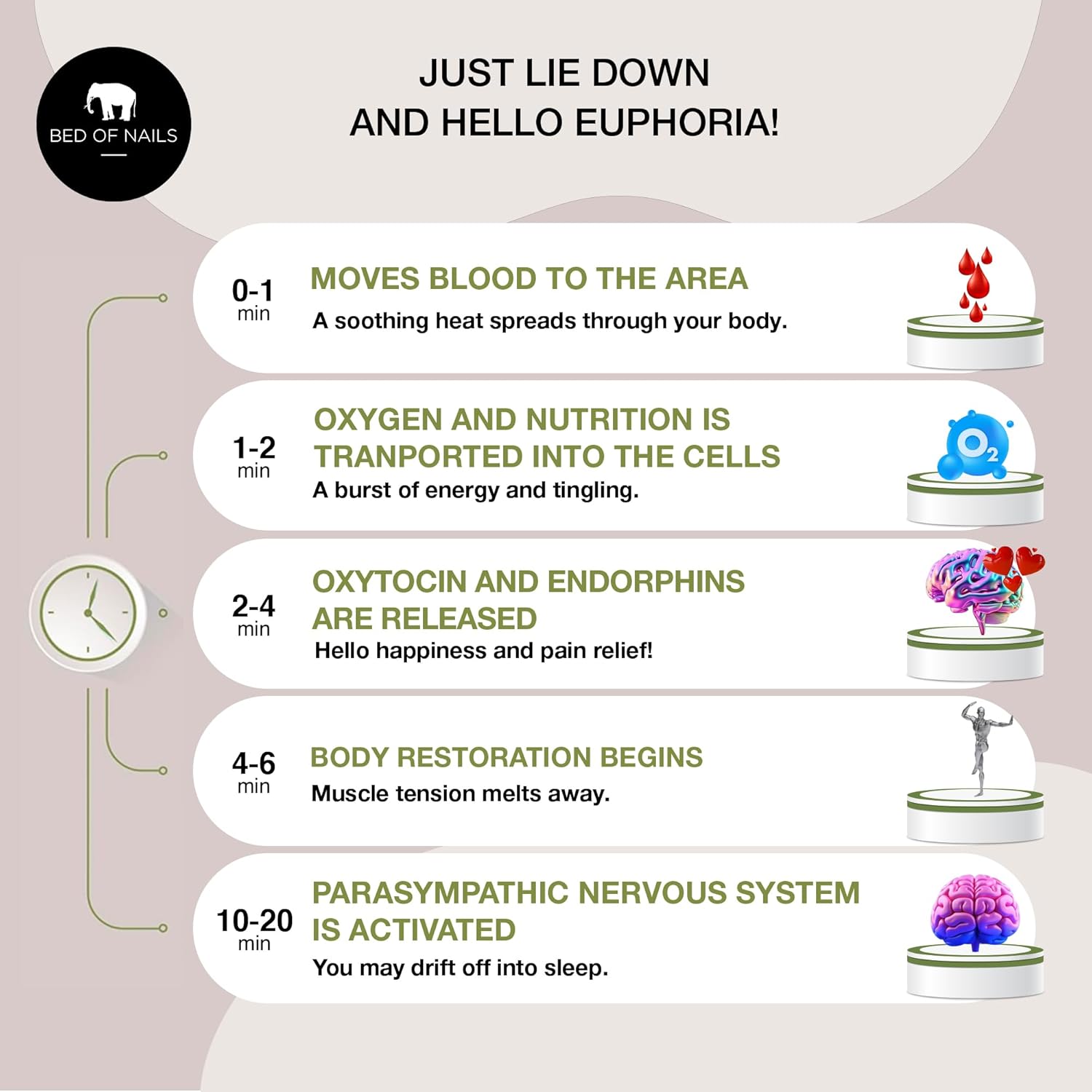 - BED OF NAILS BENEFITS: Our acupuncture mat does not penetrate the skin, but instead supports relaxation, meditation, deep sleep, stress, muscle tension, upper and lower back pain, plantar fasciitis, and more, as the body restores natural vitality, making this a great addition to your beauty tools arsenal