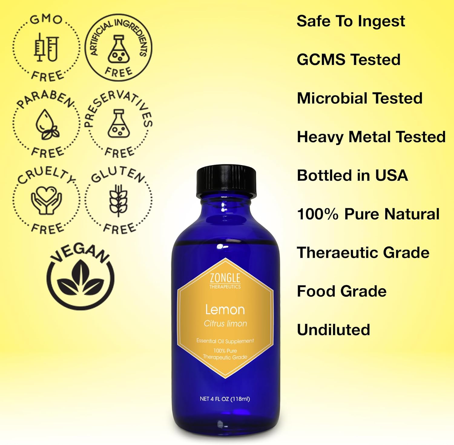 - A 100% Pure Lemon Essential Oil – Zongle Therapeutics provides food grade lemon essential oil, made from the highest quality lemons for a pure and natural product.
