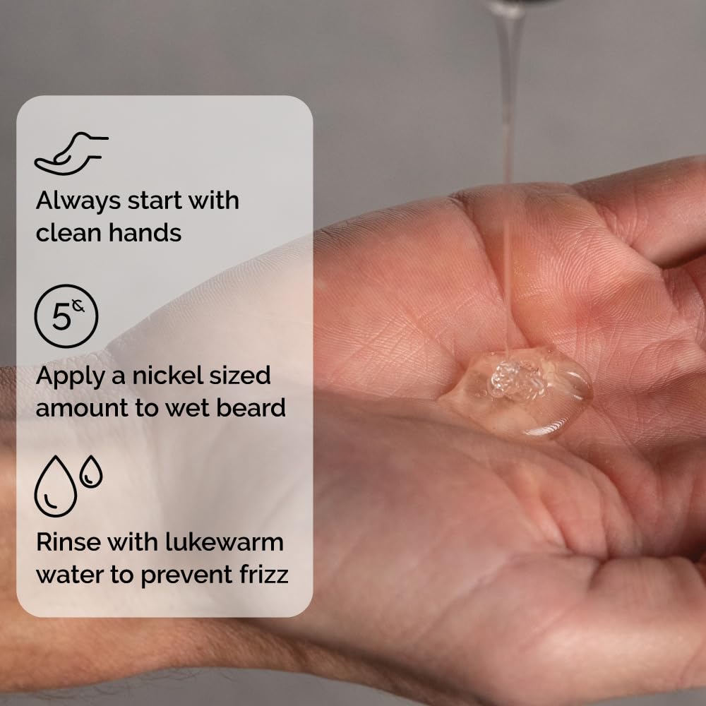 - WASH TIP: Wet your beard completely, then apply a nickel-sized amount of shampoo into your palm. Rub your hands together to activate the formula, then massage it through your facial hair using circular motions for 30 to 45 seconds. Rinse well and gently pat dry.
