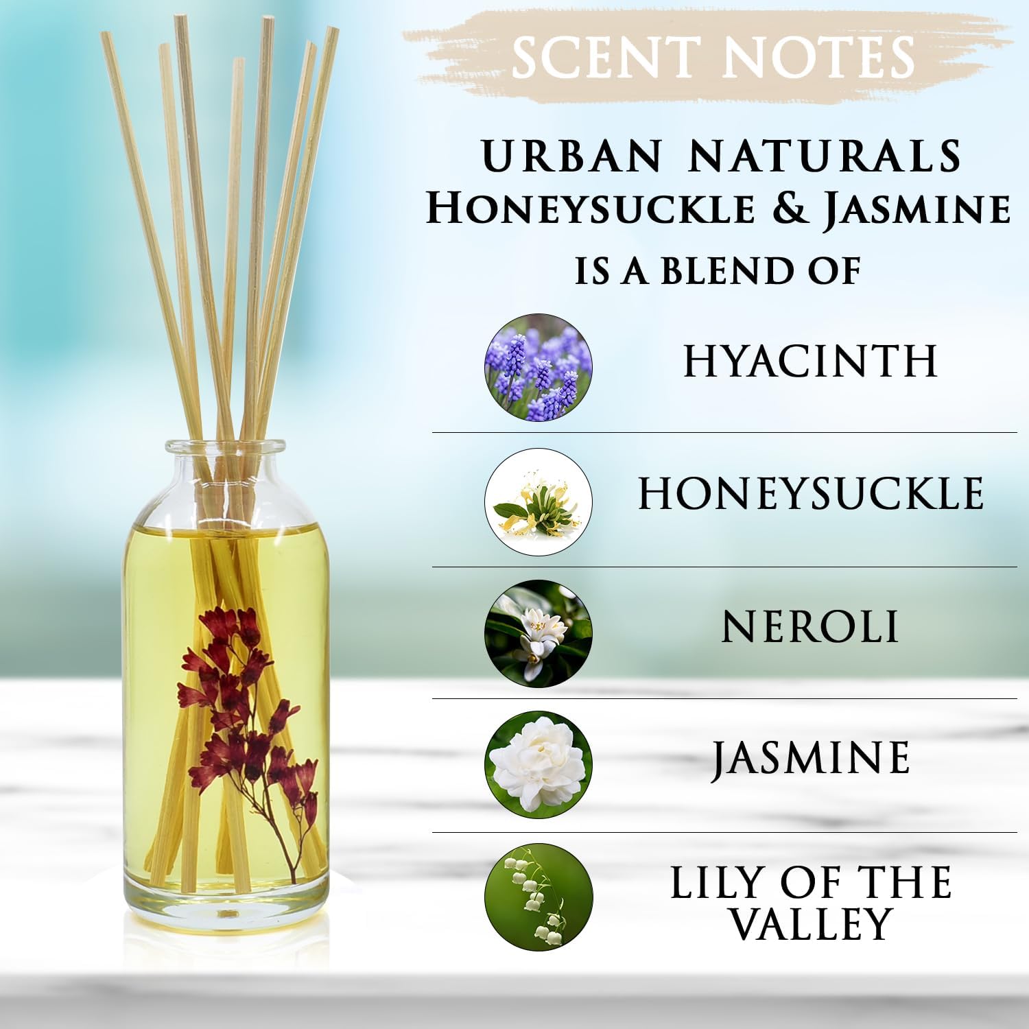 Urban Naturals Honeysuckle & Jasmine Reed Diffuser Oil Scented Sticks Set– Hyacinth, Cassis, Neroli & Geranium | Long Lasting Air Freshener for The Bedroom, Bathroom or Office | Made in The USA