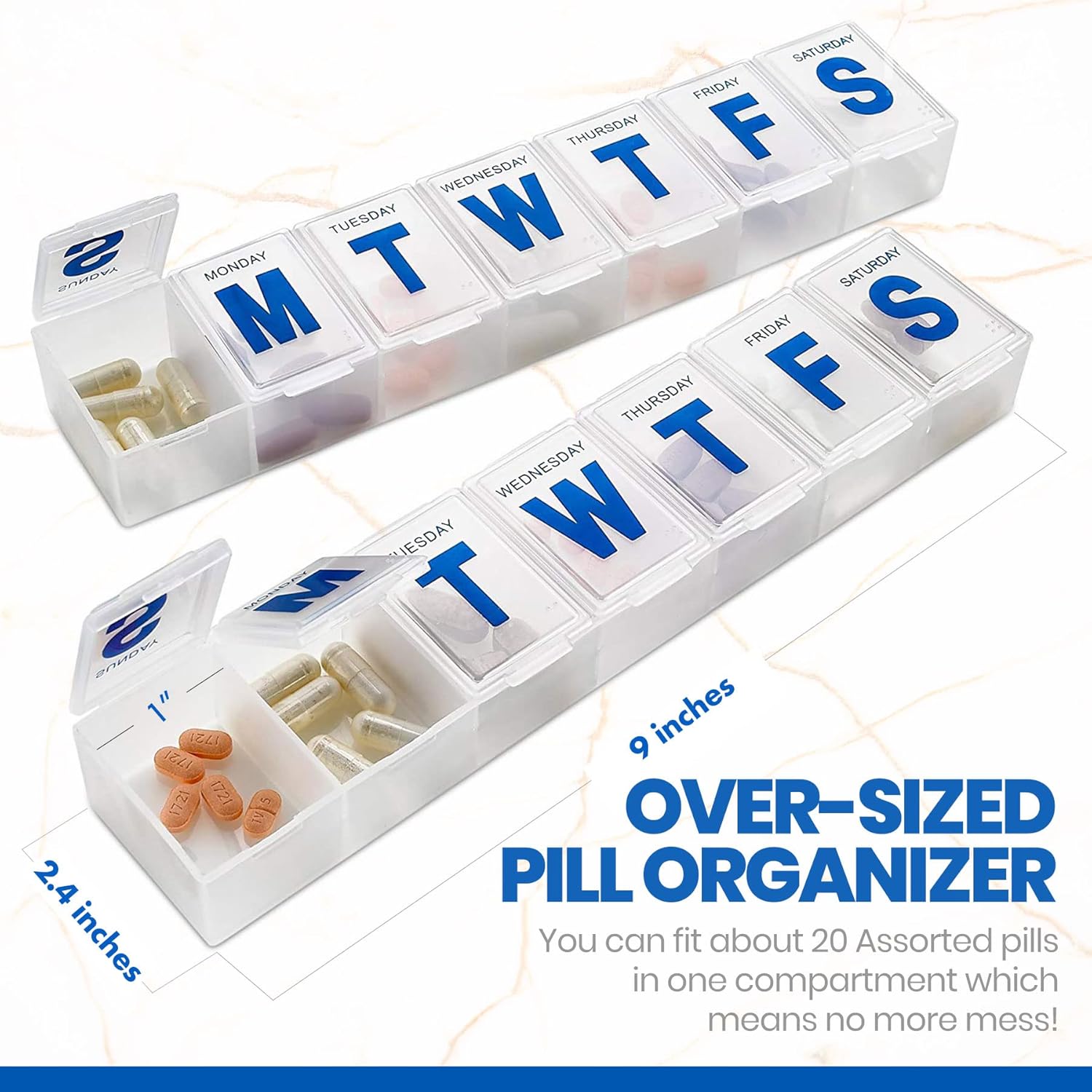 - (PACK OF 2) OVER-SIZED PILL CASES: If you've been looking for an extra large pill organizer, then your search is over! Imagine keeping medication neatly organized in one place and supplements out of the way and off the table. That's because our extra large pill box organizer 7 day has Extra-large compartments which means that you can fit about 20 assorted pills in one compartment which means no more mess!