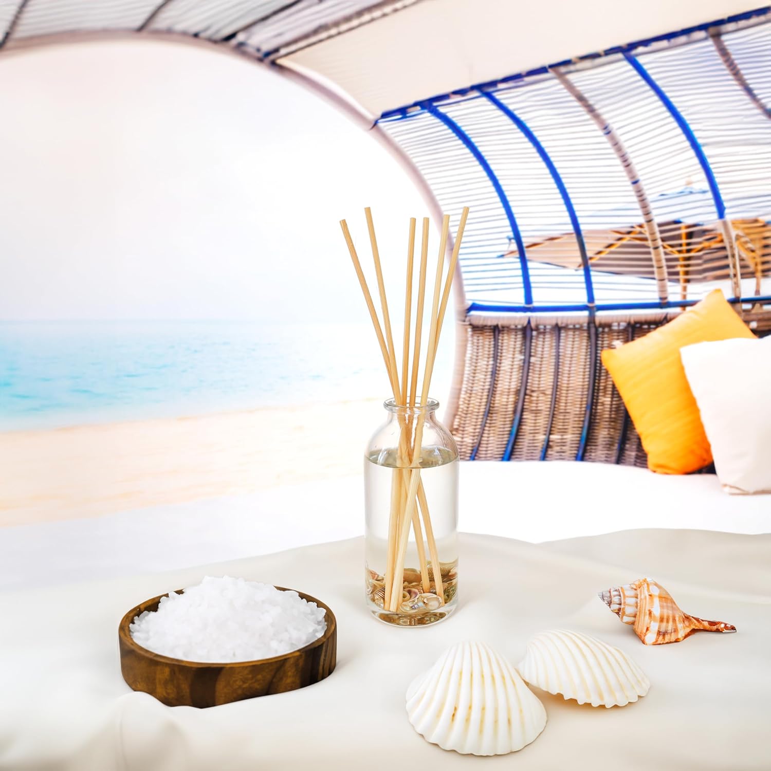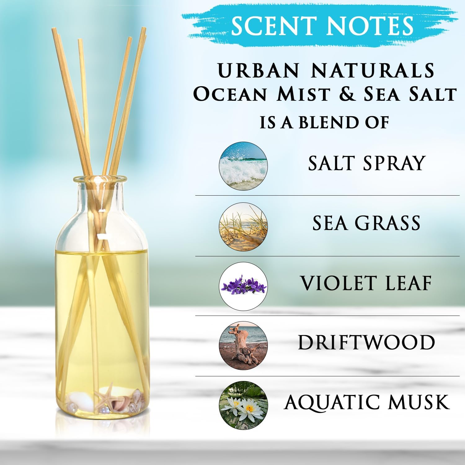 Urban Naturals Ocean Mist & Sea Salt Reed Diffuser Set | Made with Essential Oils & Real Seashells | Decorative Air Freshener Room Diffuser