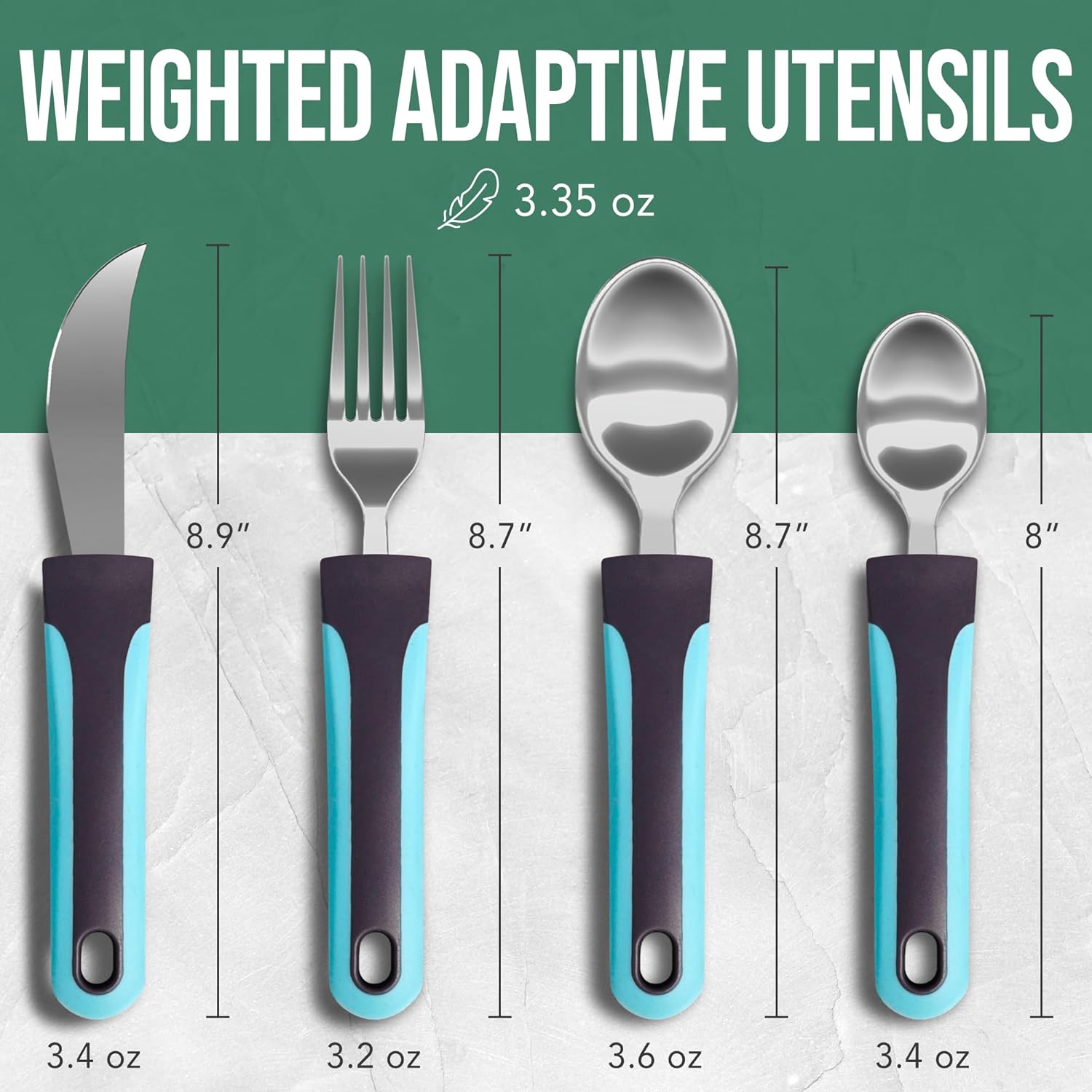 BUNMO Adaptive Utensils for Elderly, Arthritis, Weak Hand Grip, Tremors & Handicapped - Convenient Travel Pouch - 3.35oz Lightweight - Stainless Steel - Eat Independently - Adaptive Blue 4 Piece Set