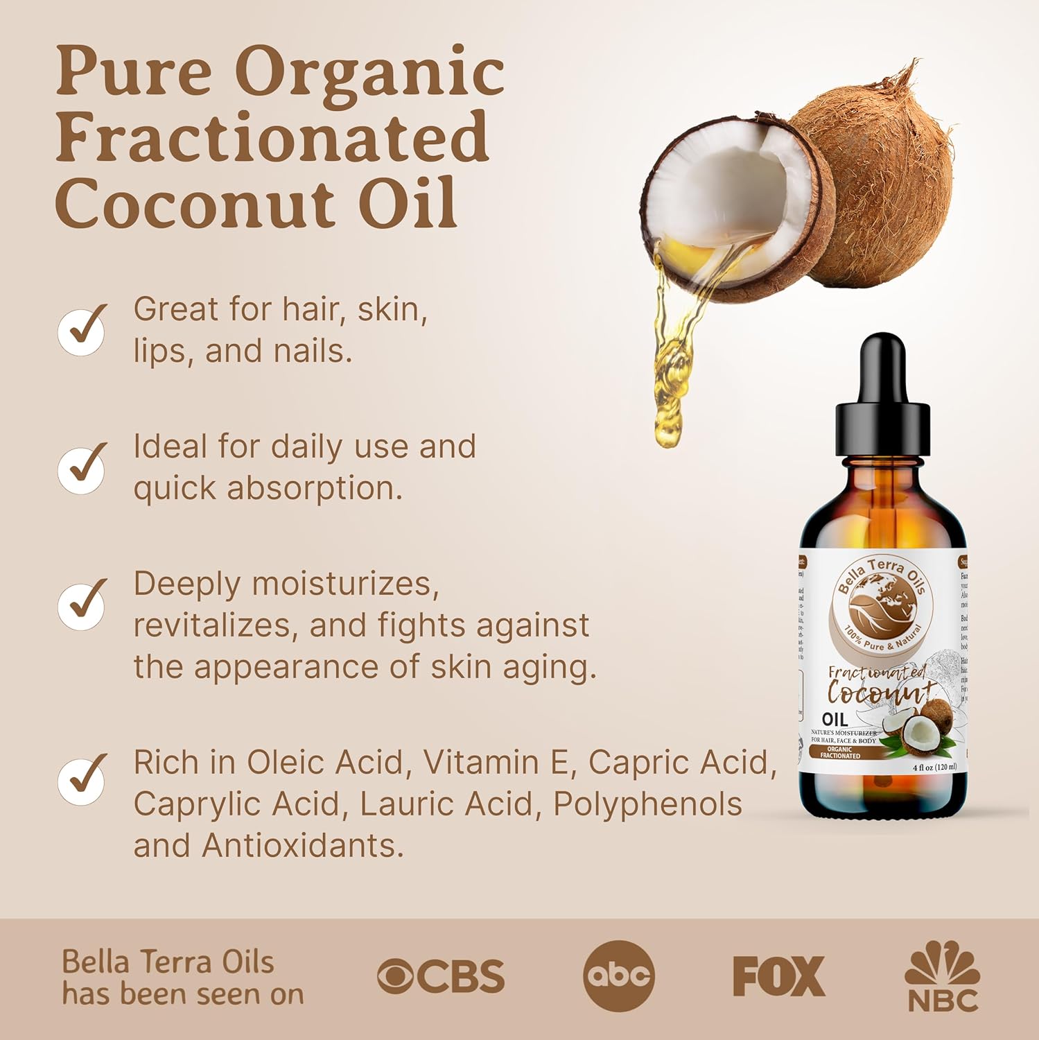 Bella Terra Oils - Organic Fractionated Coconut Oil (MCT) 4oz - Derived from Pure Coconut Essence, Abundant in Capric & Lauric Acid, Your Go-to Companion for Supple Skin