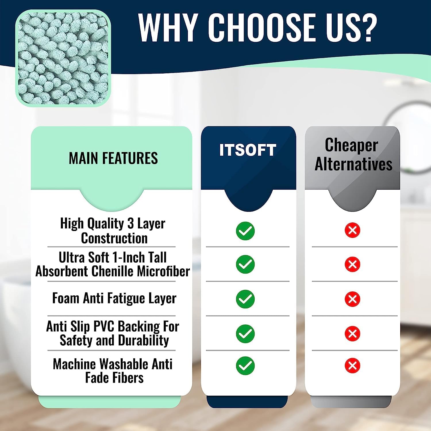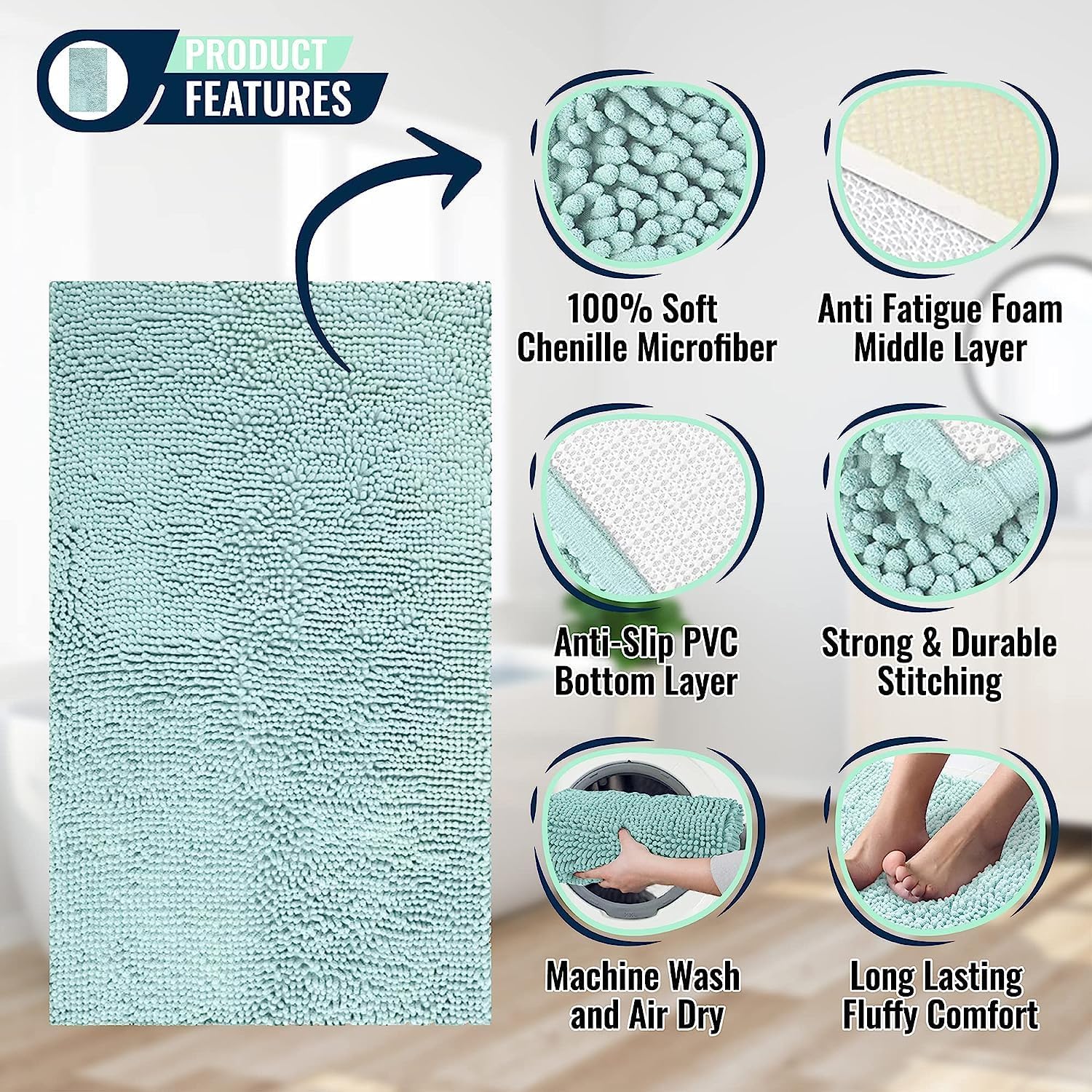 • Thick chenille microfiber bathroom rug absorbs water fast to keep floors dry. Perfect small bath rug for shower sides, vanity areas, and puddle-prone spots in the bathroom.