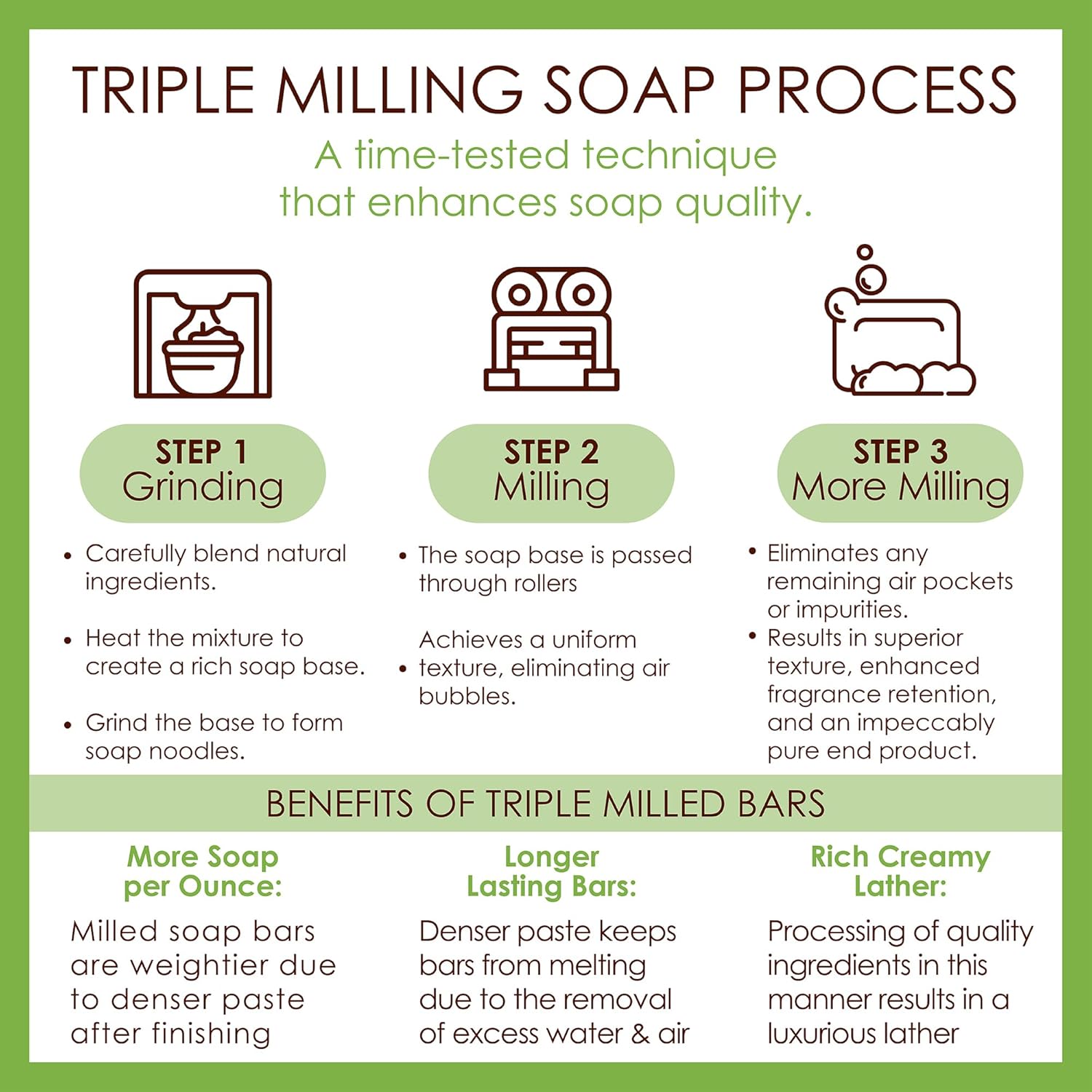 - Long-Lasting Bars - Triple-milled in the French tradition, triple-milled again for purity and smoothness, and then refined. The result is a dense and long-lasting soap with a creamy lather and a fragrance that lasts until the final sliver is gone.