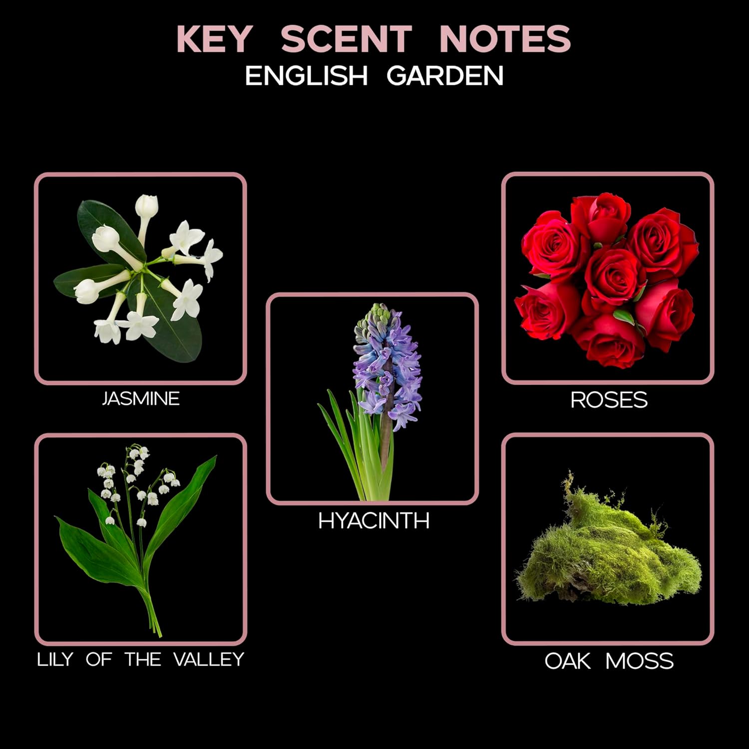 - ENGLISH GARDEN – blooms with Smooth Jasmine, Sheer Roses, Heady Hyacinth, Creamy Lily of the Valley, Lavish Oak Moss, and Subtle Musk; displayed in the Infinity Diffuser with a slender neck and lavender ribbon accent for a refined finish, enhanced with real hydrangea blooms; ideal for lush, romantic interiors.