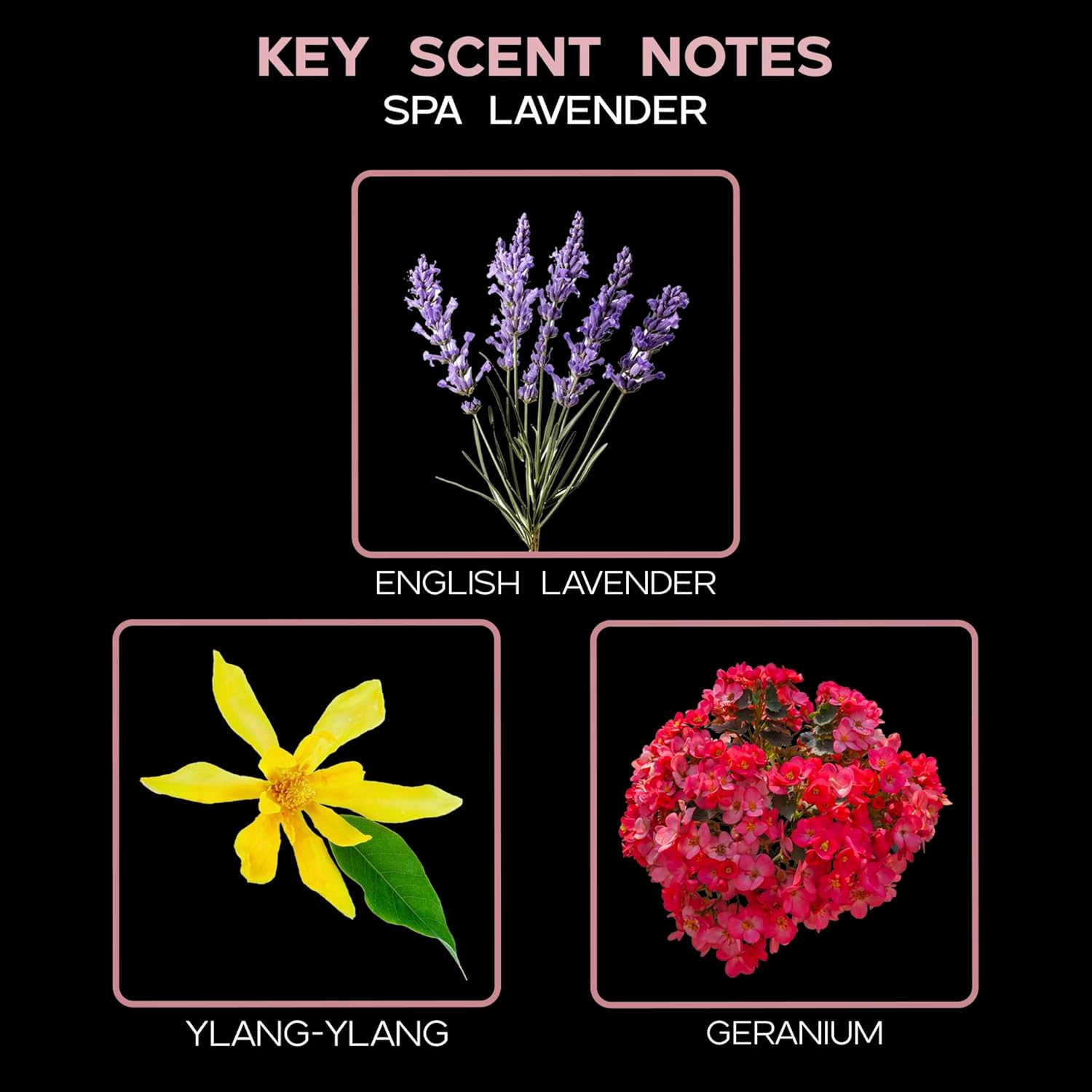- SPA LAVENDER – is a tranquil floral blend of Lavender, Ylang, and Geranium; displayed in the Infinity Diffuser with a slender neck and lavender ribbon accent for a calm, spa-inspired look; perfect for lilac, periwinkle, and soft purple home décor.