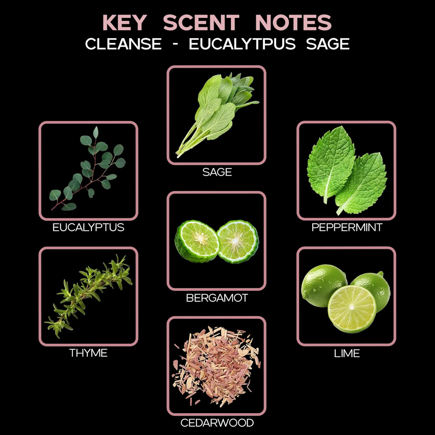 - CLEANSE EUCALYPTUS SAGE – a fresh herbal blend of Eucalyptus, Sage, Peppermint, Thyme, Bergamot, and Lime; in our Classic Elegance Diffuser with a slender neck and forest green ribbon accent for a refined touch, paired with real spiral eucalyptus stems; harmonizes beautifully with natural green, pine, and spa-inspired interiors.