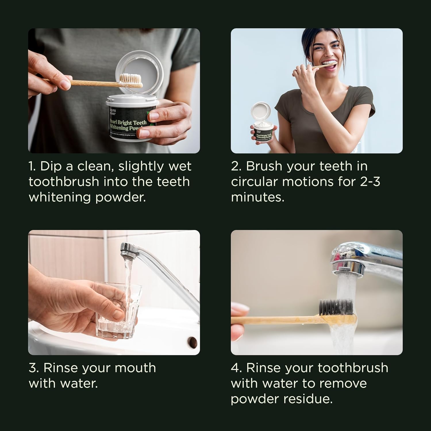 - Enjoy a brighter smile: Keep your pearly whites pristine with our advanced teeth whitening powder. Made with quality ingredients, it cleans teeth and gums, removes surface stains, and brightens your smile. It’s easy to use, too—just place your wet toothbrush into the powder and brush as normal.