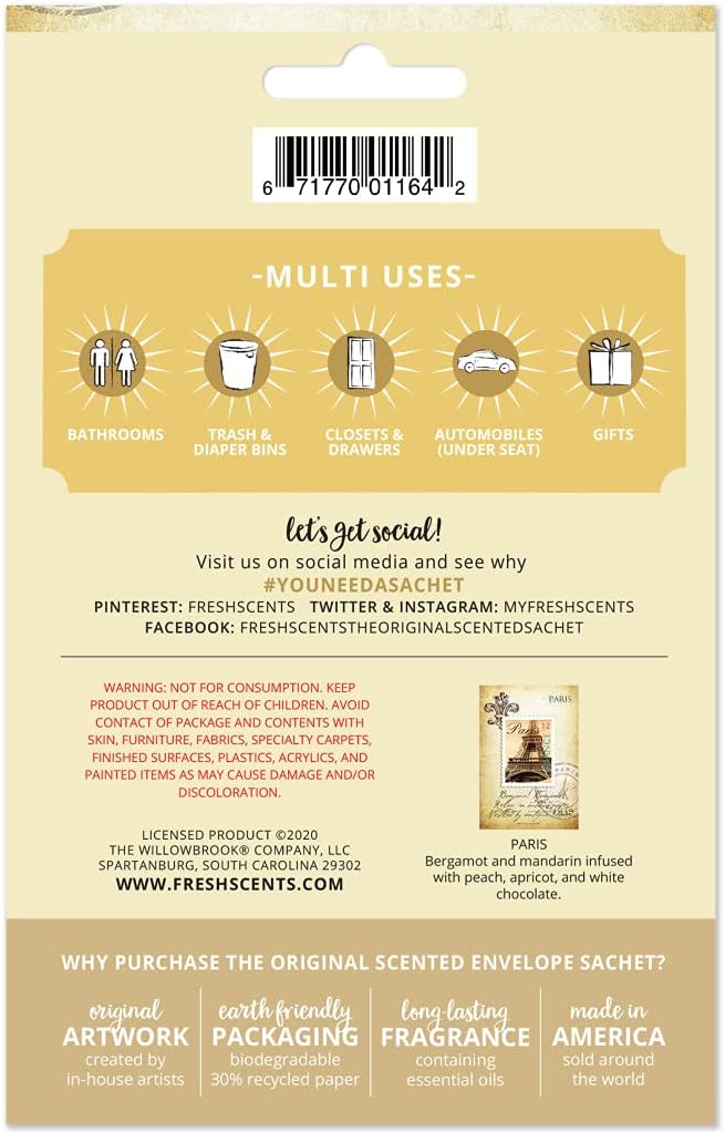 WILLOWBROOK | Fresh Scents Scented Sachet Packet | Paris | Air Freshener Bags for Drawers, Closets, Cars | 6 Pack | Long Lasting Home Fragrance