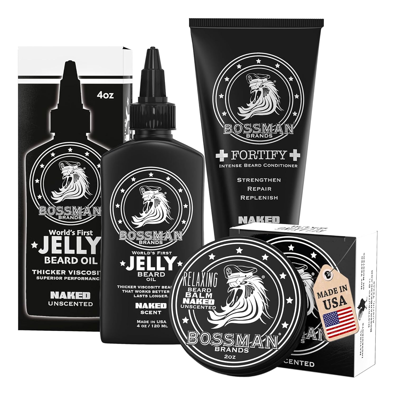Bossman Essentials Beard Kit for Men, Set of 3 - Beard Oil Jelly, Fortifying Conditioner Cream, Beard Balm - Grooming Growth Care Accessories - Gift Set for Men (Naked - Unscented)