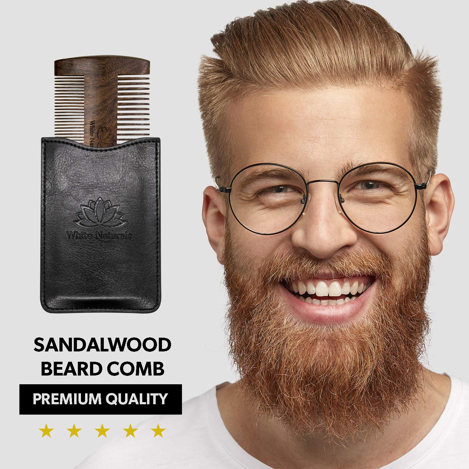 White Naturals Beard Comb for Men, Wooden Natural Sandalwood, Fine Dual Action Teeth, Handmade Premium Sandal Wood, Perfect for Balms and Oils, Includes PU Leather Case, Pocket Size