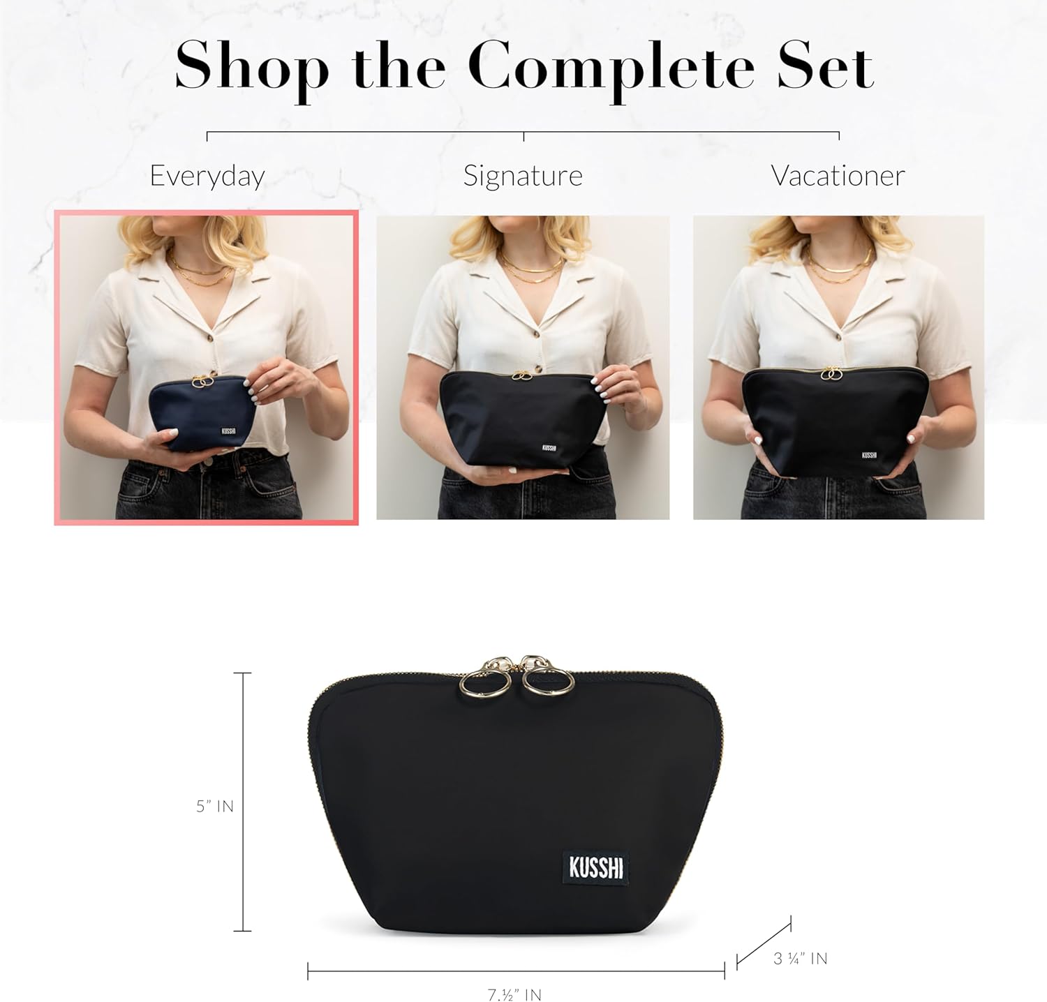 - Everyday Makeup Bag – This small makeup bag is perfect for on the go: keep your toiletries, cosmetics, and skincare organized and secure. The bag provides effortless organization for your everyday essentials, it holds 5-10 products and measures 7.5” x 5”. Bring your must-haves wherever you go!