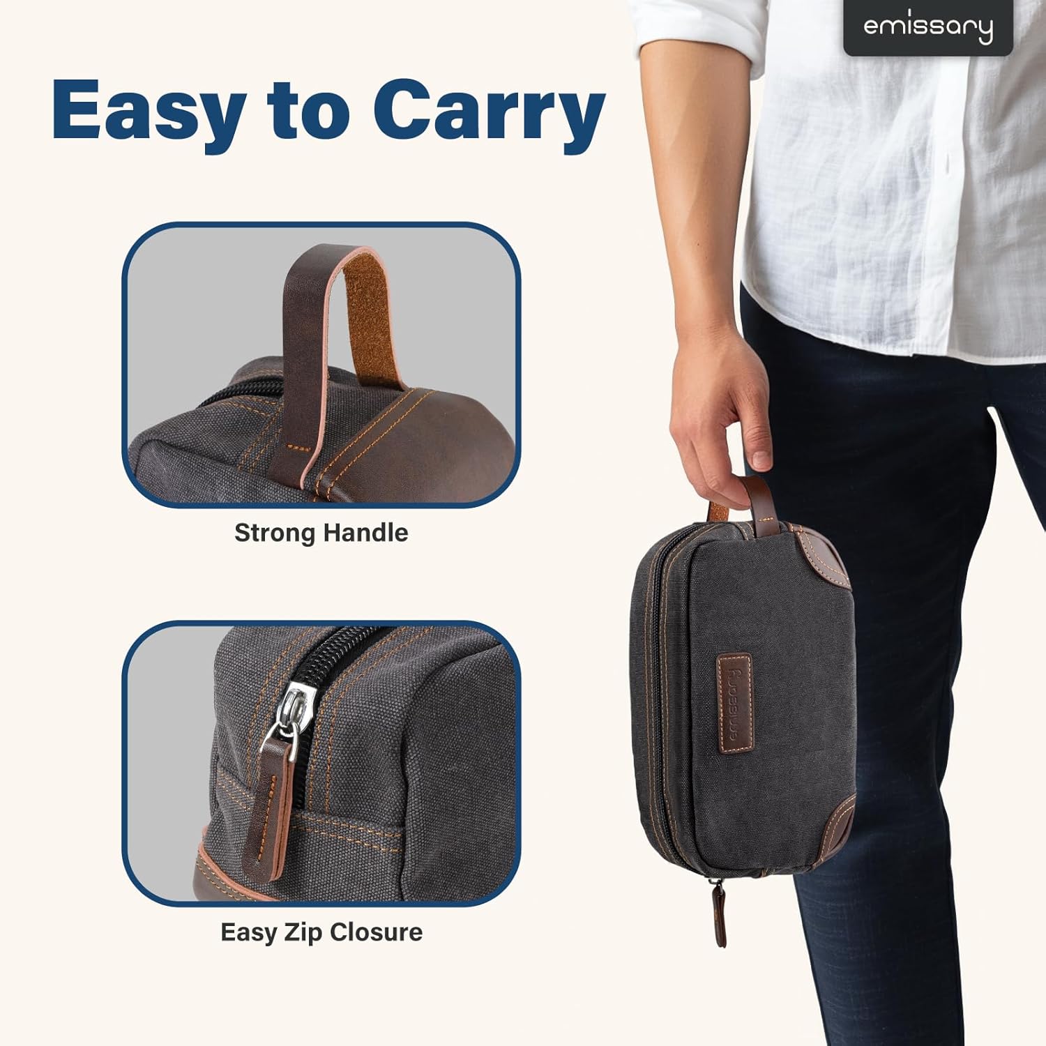 - HIGH-QUALITY DURABLE MATERIAL: This exceptional toiletry travel bag by emissary is made of canvas and PU leather, which is known for its lightweight yet durable qualities, the perfect combination for traveling. This specific material is water resistant, making it safe for use in environments where it may become wet. Making this the perfect bathroom bag, shaving bag, and travel dopp kit.