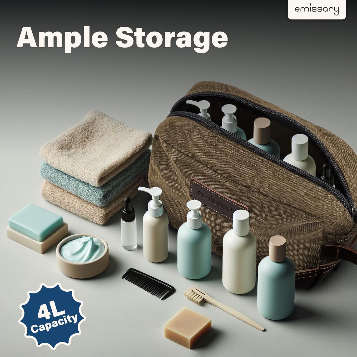 - HIGH-QUALITY DURABLE MATERIAL: This exceptional toiletry travel bag by emissary is made of canvas and PU leather, which is known for its lightweight yet durable qualities, the perfect combination for traveling. This specific material is water resistant, making it safe for use in environments where it may become wet. Making this the perfect bathroom bag, shaving bag, and travel dopp kit.