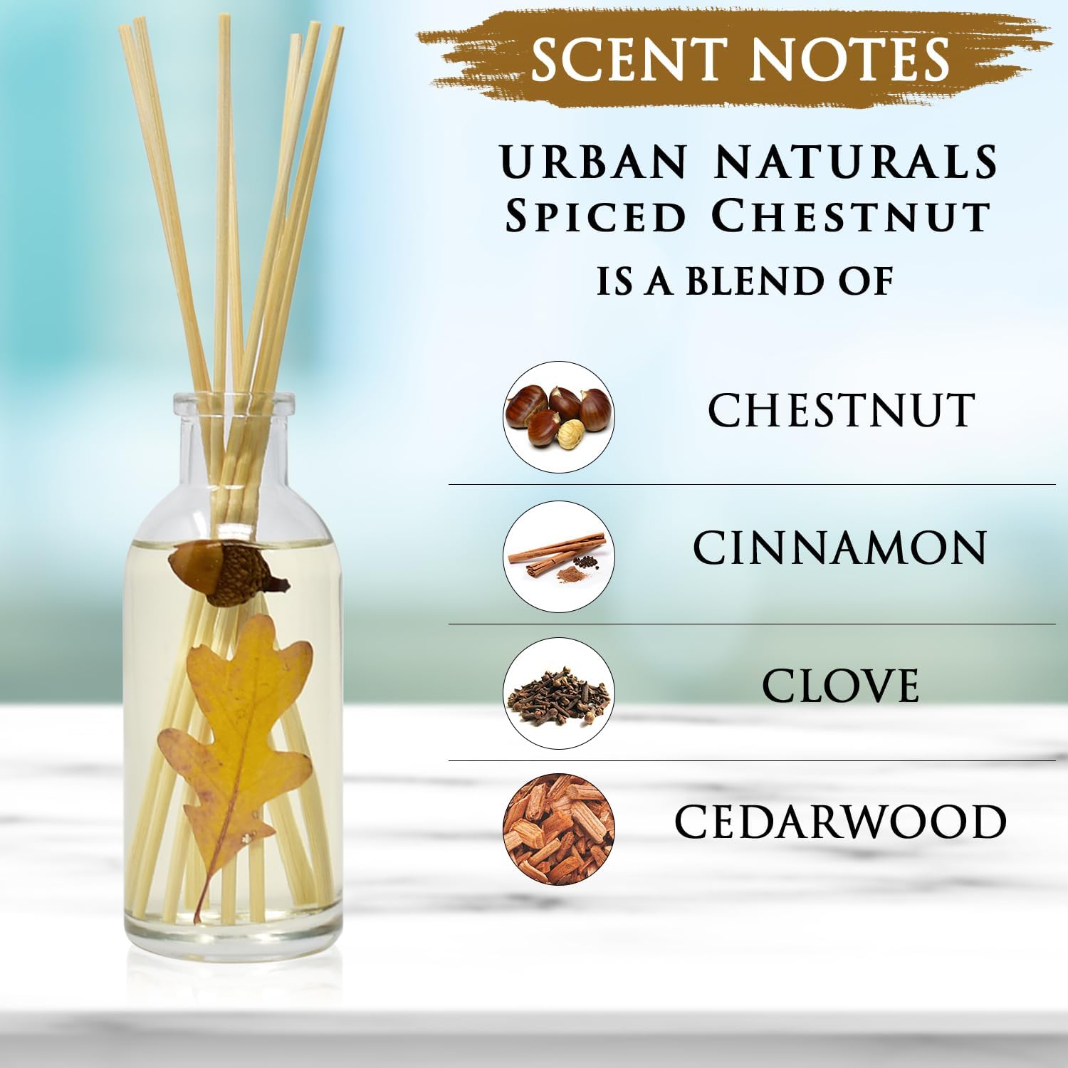 Urban Naturals Spiced Chestnut Reed Diffuser Sticks and Oil Set β Comforting Autumn Scent of Chestnuts, Cinnamon, Clove and Cedar Wood with Real Acorns and Fall Leaves β 3.75 Ounces β Made in The USA