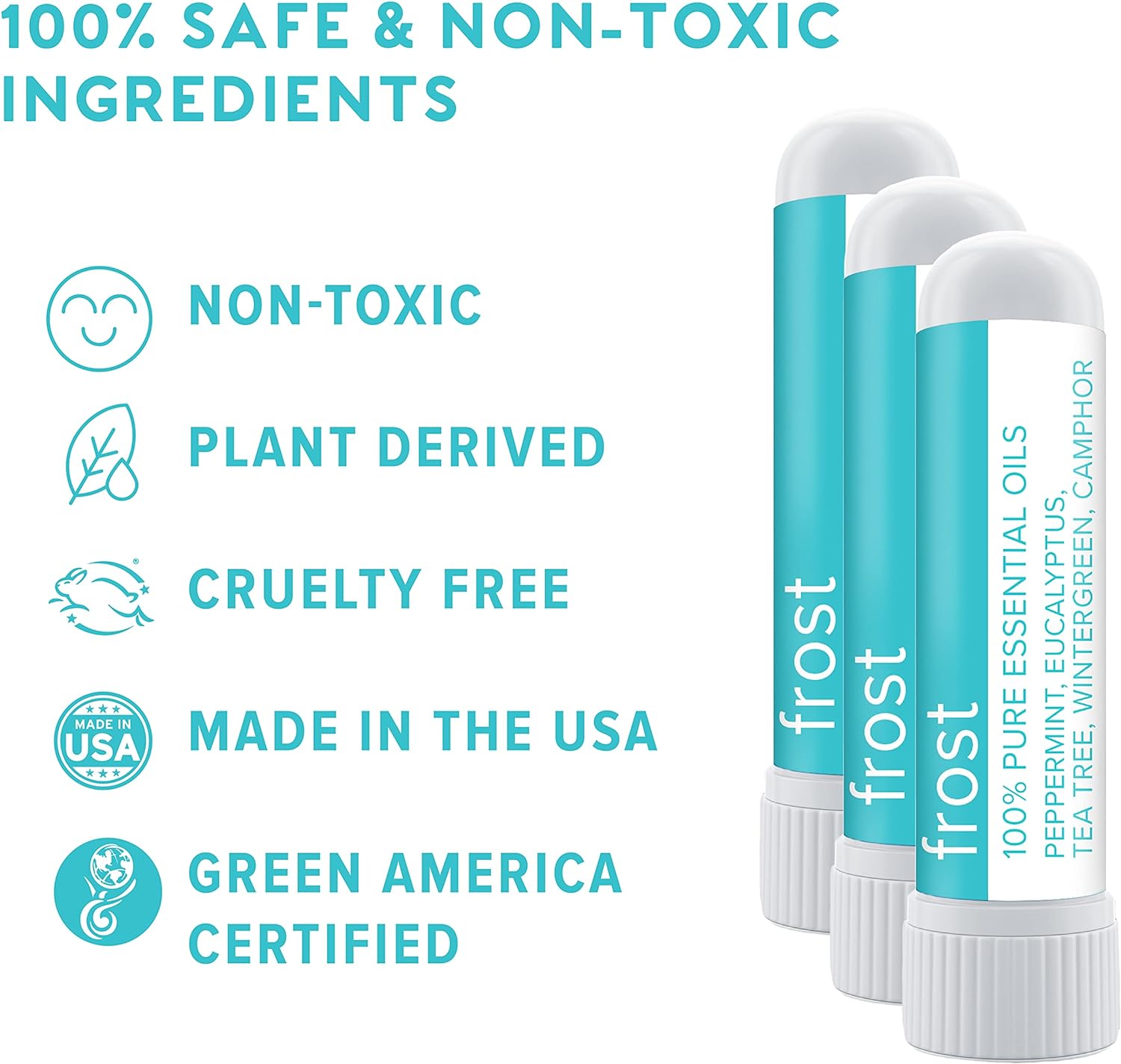 - Made in America - Using an all-natural blend of organic essential oils, we loving make all of our inhalers in the United States using only pure steam-distilled essential oils of the highest quality. Disclaimer: Inhale gently. Frost is made with 100% pure essential oils. They're naturally very strong and can cause discomfort if inhaled aggressively.