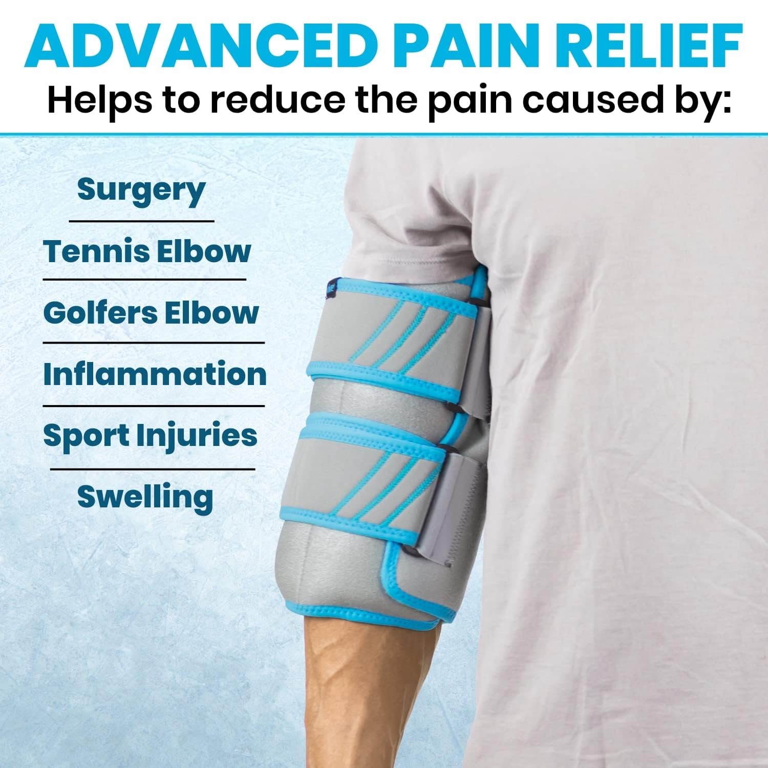 - EASE ELBOW PAIN AND STIFFNESS: Providing targeted heat or cold therapy, the Vive elbow ice wrap relieves pain, swelling and stiffness in the elbow due to tennis elbow, tendonitis, arthritis, golfer’s elbow, sprains and strains. The flexible elbow wrap also provides moderate compression, aiding in the relief of fatigue, soreness from overuse and repetitive motion injuries.