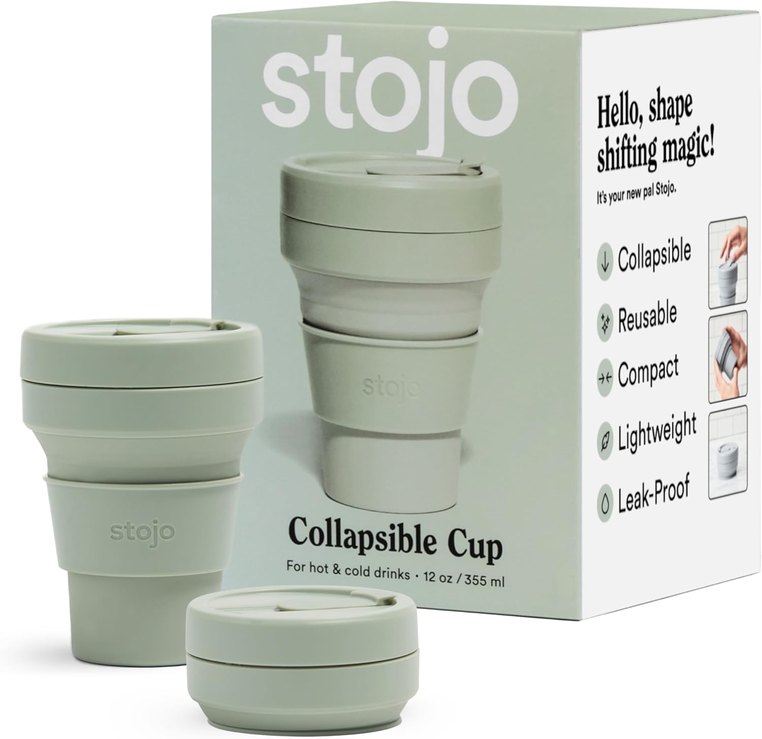 STOJO Collapsible Travel Cup - Reusable To-Go Pocket Size Silicone Bottle for Hot and Cold Drinks - Perfect for Camping - Microwave & Dishwasher Safe (Sage, 12 Ounce (Pack of 1) - No Straw)
