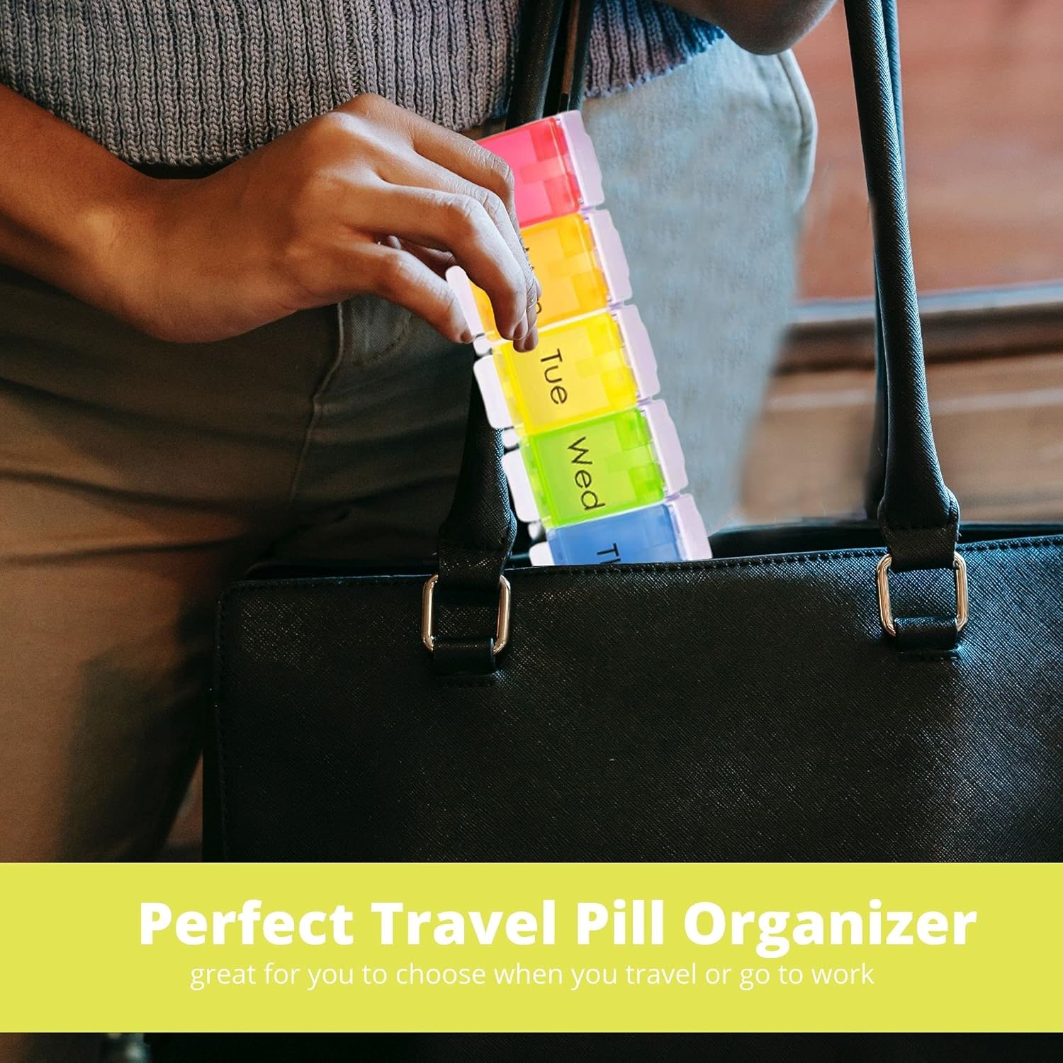 PERFORMORE Portable Weekly 7-Day Pill Organizer, Travel Medicine Box, Rainbow Color, BPA Free with Easy Push Button Design Case Holder for Pills, Vitamin, Supplements and Medicine