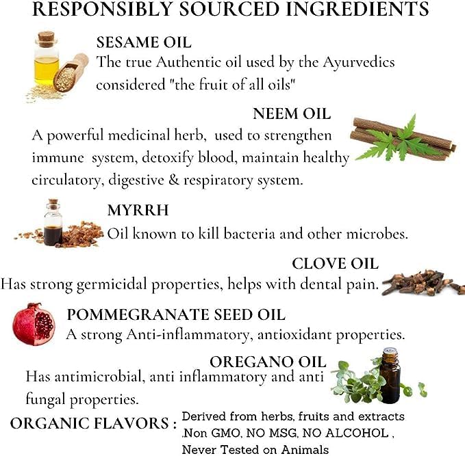- Strengthens Teeth & Supports Healthy Gums: A powerful blend of sesame, sunflower, olive, neem, and clove oils nourish gums and teeth. Our antibacterial properties are designed to keep teeth clean and your mouth fresh, this prevention mouth rinse promotes long-term oral wellness with every use. This unique whitening teeth rinse is a perfect blend of oil, herbs, and extracts that will leave your breath, teeth, and gums invigorated for hours.