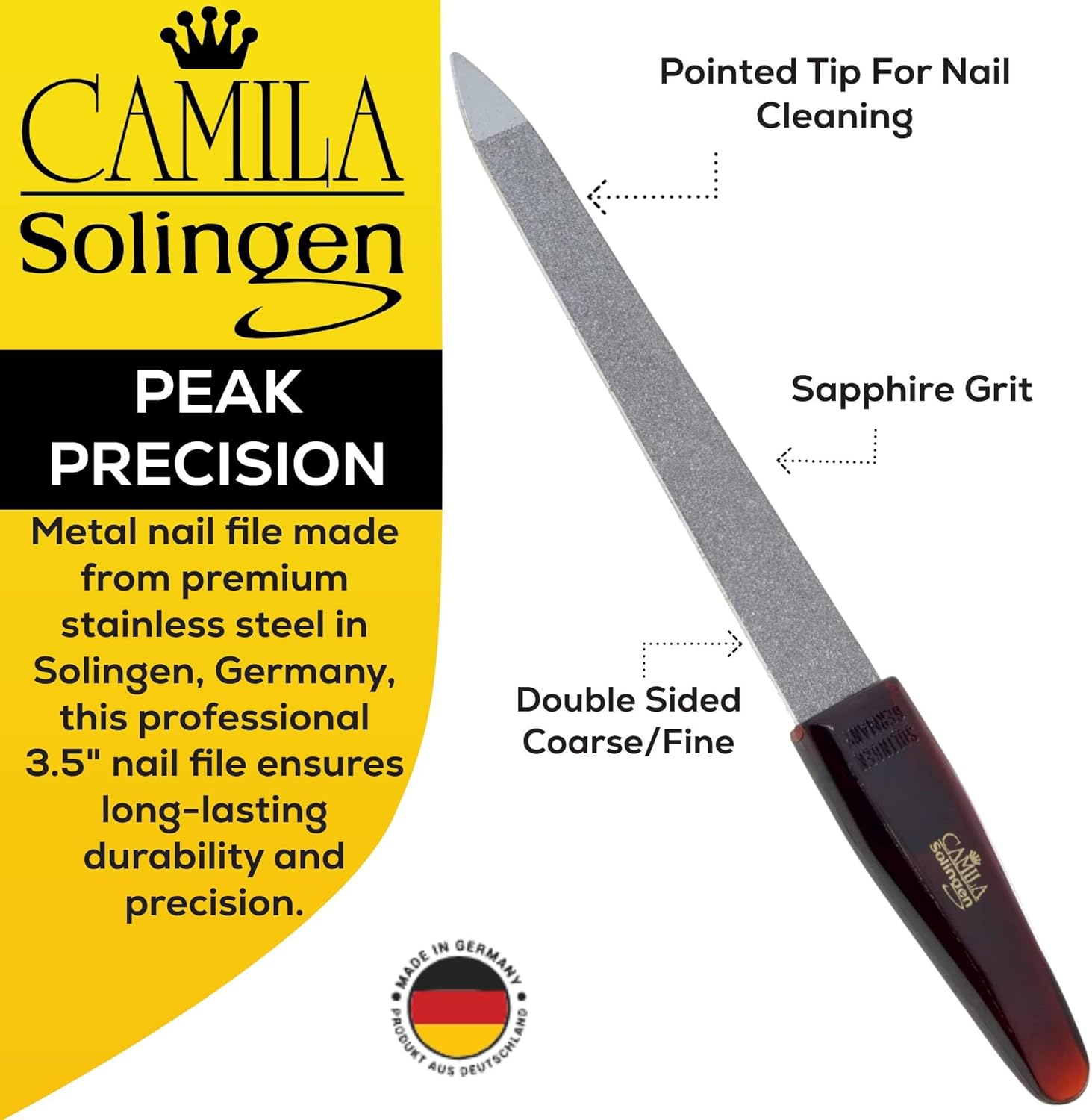 • Metal nail file made from premium stainless steel in Solingen, Germany, this professional 3.5" nail file ensures long-lasting durability and precision. Its rust-free, anti-corrosive design is trusted by beauty professionals worldwide.