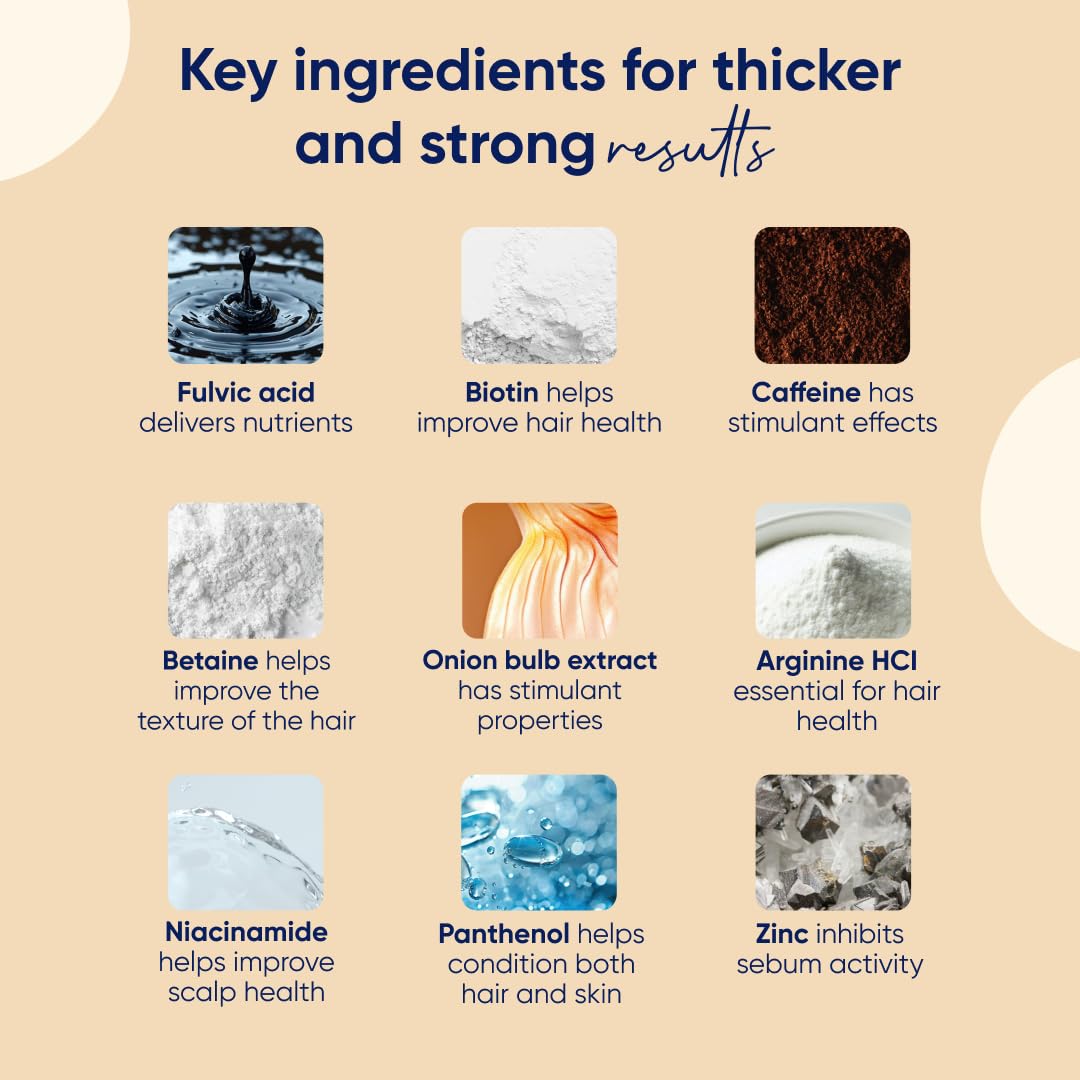 - 77 Minerals, 18 Proteins, 5 Vitamins: Each ingredient in our hair thickening spray has a special purpose; Caffeine blocks DHT; Fulvic acid helps funnel nutrients to each individual follicle; Biotin boosts keratin production to strengthen and lengthen hair – and that’s only the beginning