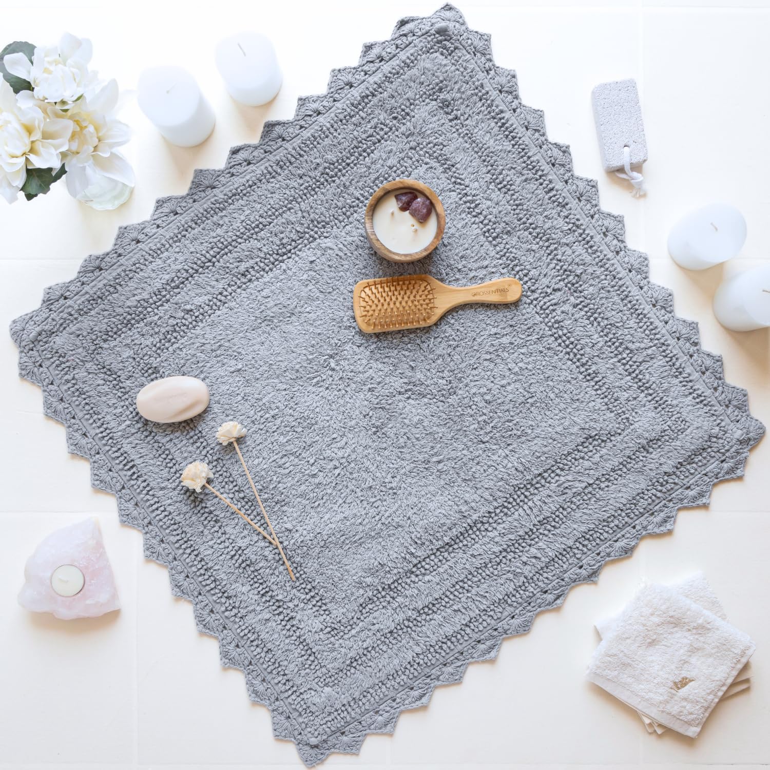 RAJRANG Bathroom Rug for Kitchen and Spa with Crochet Pattern Cotton Absorbent Soft Reversible Bath Mat Light Grey Square 24 Inches