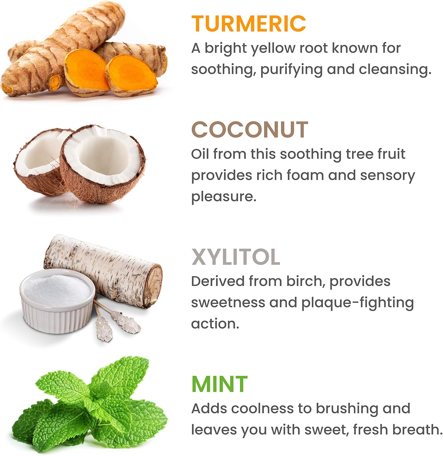 - Herbal teeth whitening toothpaste: Combines a botanical boost from golden Turmeric, celebrated for its cleansing and wellness properties, with soothing Coconut Oil to deliver a sparkling smile