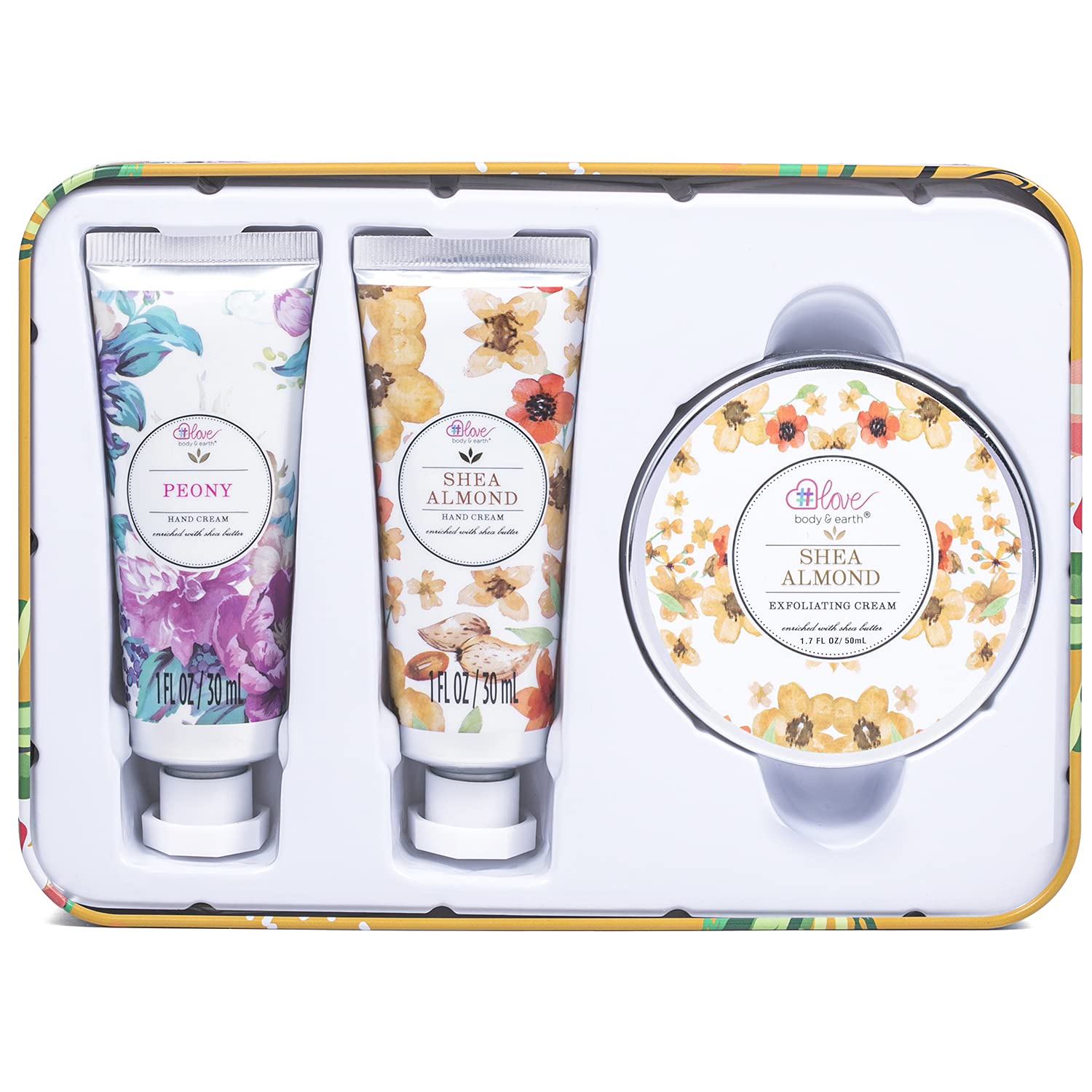 BODY & EARTH # LOVE Hand Cream Gift Set, Hand Lotion Sets for Mothers Day Gifts, Hand Care Set with Shea Butter, Travel Size Lotion Set for Women, 2 Hand Cream & Exfoliating Cream, Birthday Gifts Box