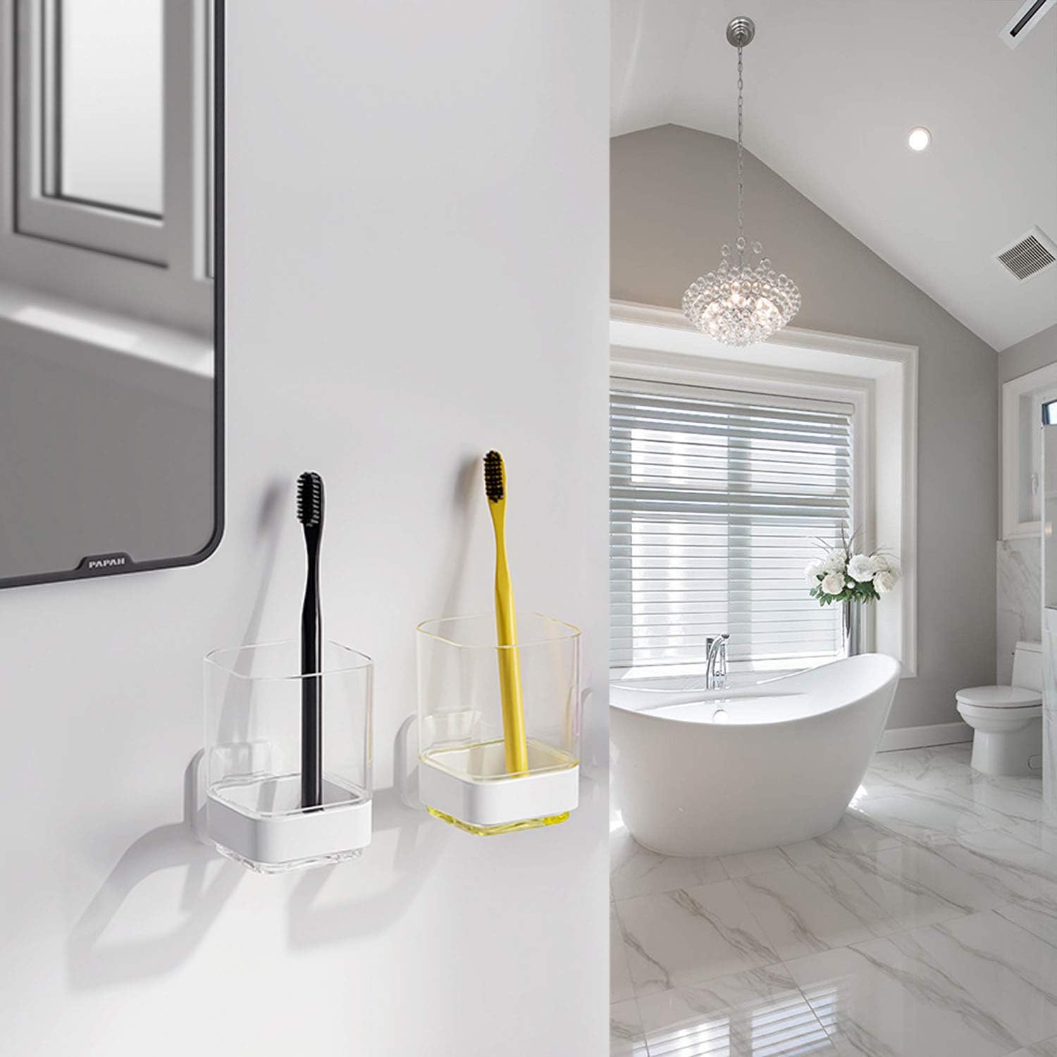 - BATHROOM ORGANIZER: Toothbrush Holder is manufactured to standards that ensure the highest strength and durability in wet environments. Clear plastic toothbrush holder cup suctions onto shower walls or bathroom and vanity mirrors to hold your toothbrushes, toothpastes, and razors, makeup tools or to be used as a tumbler rinsing cup. Great for master bathrooms, kid's, guest's bathrooms, or kitchen.