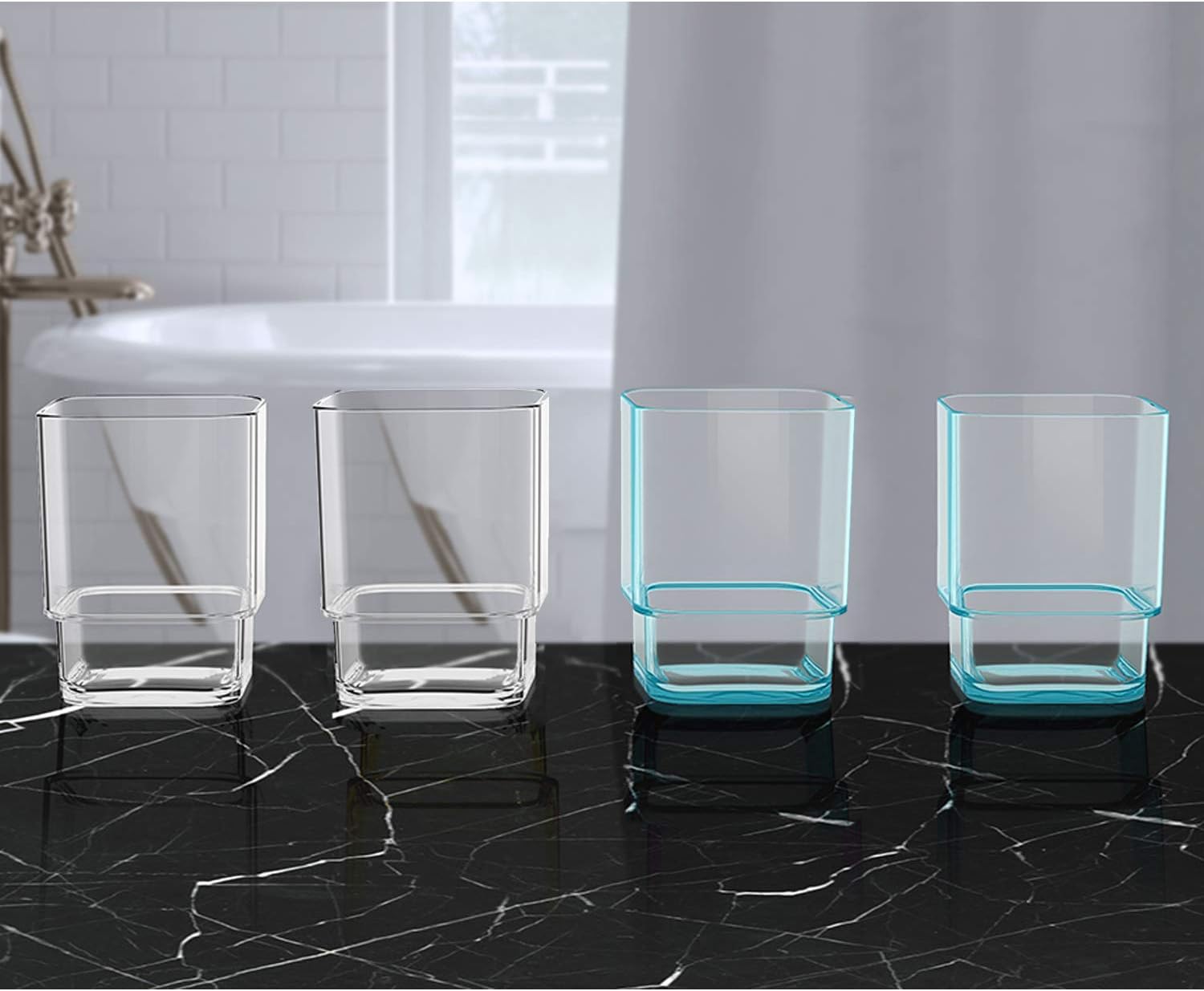 - DURABLE: Clear durable plastic for years of quality use. These accessories charm not just by how easily they attach, and hold, but also by how well they stay shiny, and rust free. They are a perfect addition to any bathroom, wet, or humid room. The toothbrush tumbler helps open up space around the sink, with enough space to hold multiple toothbrushes, and toothpaste. The Transparent organic tumbler is detachable for easy access and cleaning.