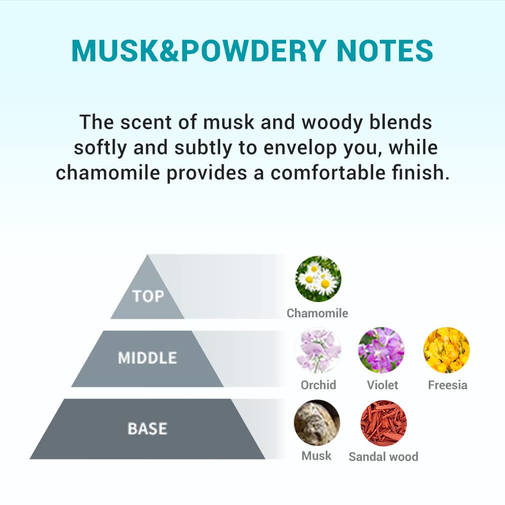 - GENTLE WOODY SCENT: Delivers a warm, comforting finish with musk and sandalwood base notes, orchid, violet, and freesia middle notes, and a soothing chamomile top note for a relaxing aroma.